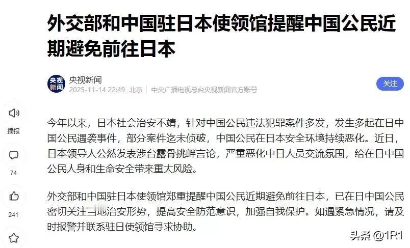 中方急发赴日警示,日方回应引热议! 中方因日本治安恶化、涉台挑衅言论,紧急提醒公民避免赴日,六家航司同步开放免费退改。对此日方回应称“与认知有差异”,呼吁多层次沟通,还要求中方“妥善应对”。网友怒评:先改错误言行再谈沟通!中方驳斥日媒 中使馆提醒