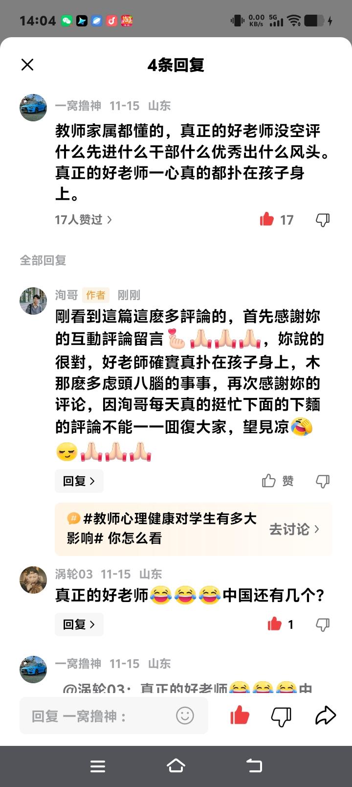 洵哥這兩天有點忙,看到的有點晚剛囬復第一个,再這兒也感謝今日头条平台给洵哥的解封推送,👇👇🙏🙏🙏 洵哥囬後洵哥創作的文章讀者閱讀評論區留言评论: 剛看到這篇這麽多評論的,首先感謝妳的互動評論留言[比心][祈祷][祈祷][祈祷],妳說的很對,好老師確實真扑在孩子身上,木那麽多虑頭八腦的事事,再次感謝妳的评论,因洵哥每天真的挺忙下面的下麵的評論不能一一囬復大家,望見凉[捂脸][害羞][祈祷][祈祷][祈祷]//@一窝撸神:教师家属都懂的,真正的好老师没空评什么先进什么干部什么优秀出什么风头。真正的好老师一心真的都扑在孩子身上。