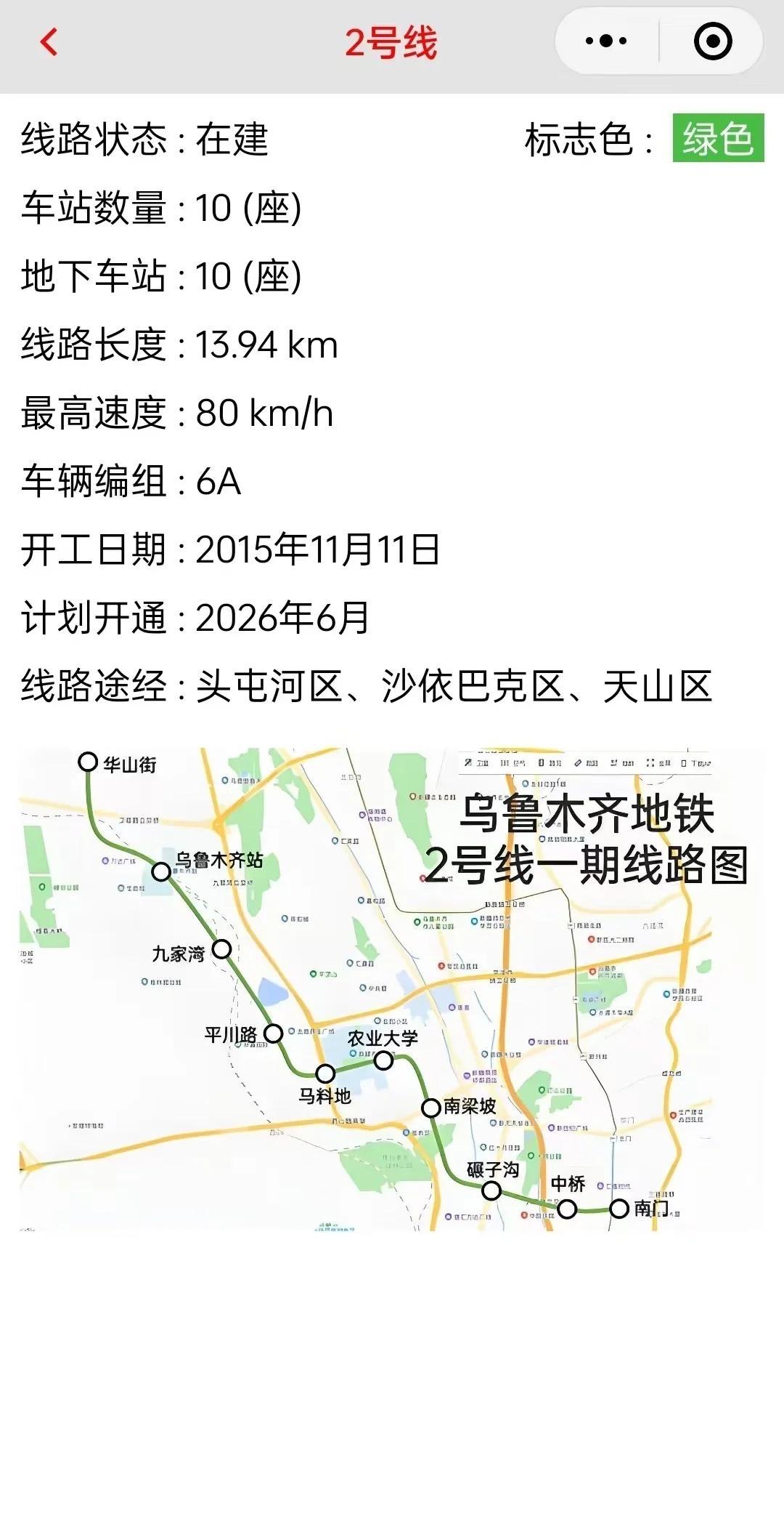 乌鲁木齐地铁2号线最新消息! 根据最新信息,乌鲁木齐地铁2号线北段(华山街站至南门站)建设进展顺利,计划于2026年6月开通初期运营。该段全长约13.94公里,均为地下线,共设10座车站,目前车站主体结构已全部封顶,轨道区间已贯通,并进入机电设备安装和综合联调阶段。开通后可在南门站与1号线换乘,显著提升天山区、沙依巴克区等区域的公共交通效率。 2号线北段是乌鲁木齐南北向的骨干线路,将有效分流1号线客流,串联高铁站、老城区及新开发区,预计南北通勤时间缩短30%以上1。未来二期工程(华山街站至机场东站)计划同步开通,进一步连接机场与核心城区。地铁2线 2号地铁 地铁2号3号线 二号线地铁线 乌鲁木齐地铁 地铁z2 2号线北延