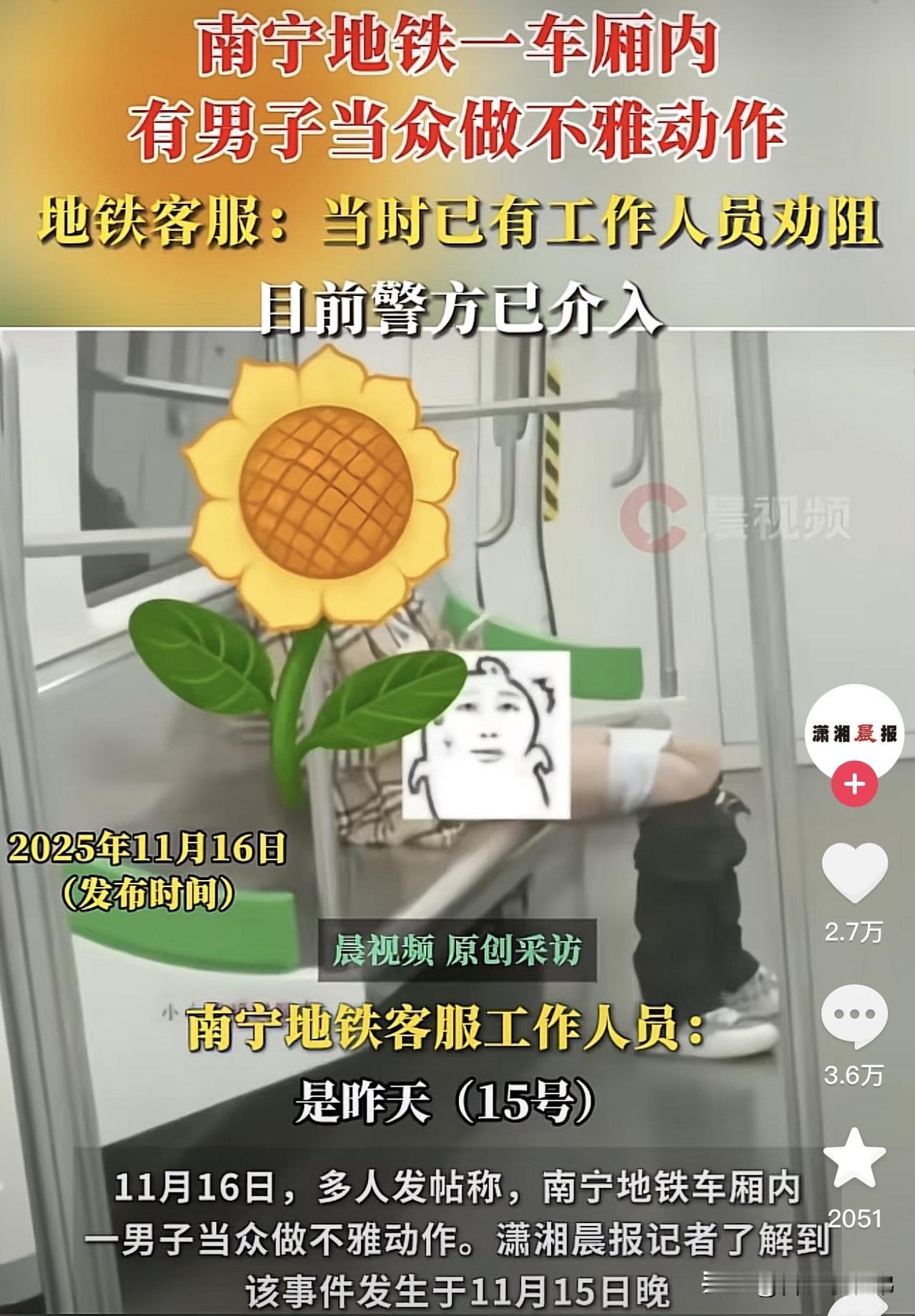 晒图笔记大赛南宁一男子在地铁当众做不雅动作短短5天!南宁地铁接连曝出两起不雅事件,刷新下限!11月11日,3号线总部基地站一男子在距卫生间不足2米处当众排便,无码监控视频外泄疯传,事发地竟遭跟风打卡。15日晚,另一男子疑似酒后在地铁车厢裸露隐私部位做不雅动作,幸被工作人员及时劝阻,目前已被警方依法行政拘留。公共空间不是私人领地,挑战公序良俗的行为该严惩!监控泄露也需严查,文明城市底线不容突破[翻白眼][翻白眼][翻白眼]!