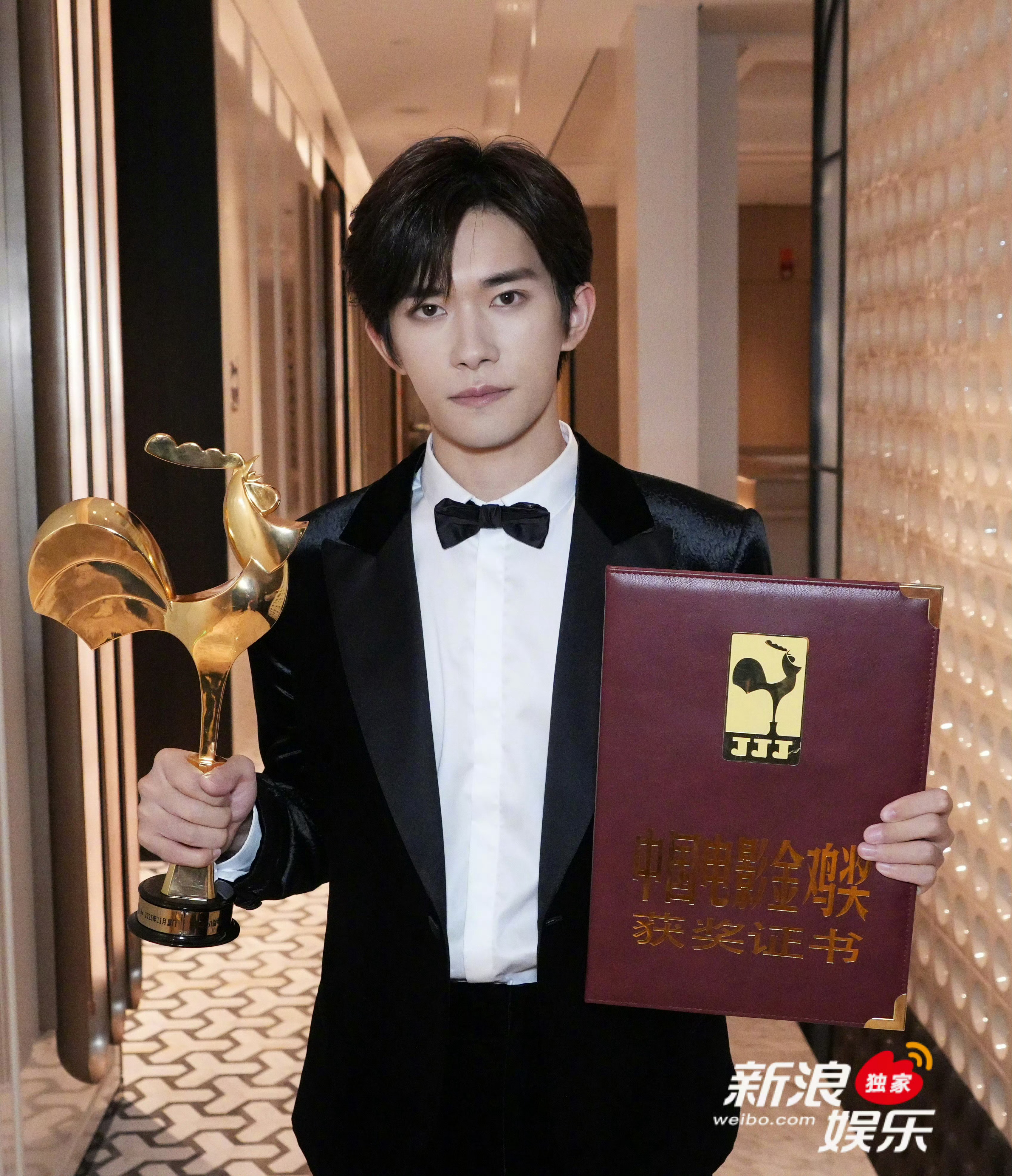 易烊千玺与自己的金鸡奖最佳男主角奖杯、证书合照,金鸡奖史上最年轻的影帝,期待未来更多好看的作品