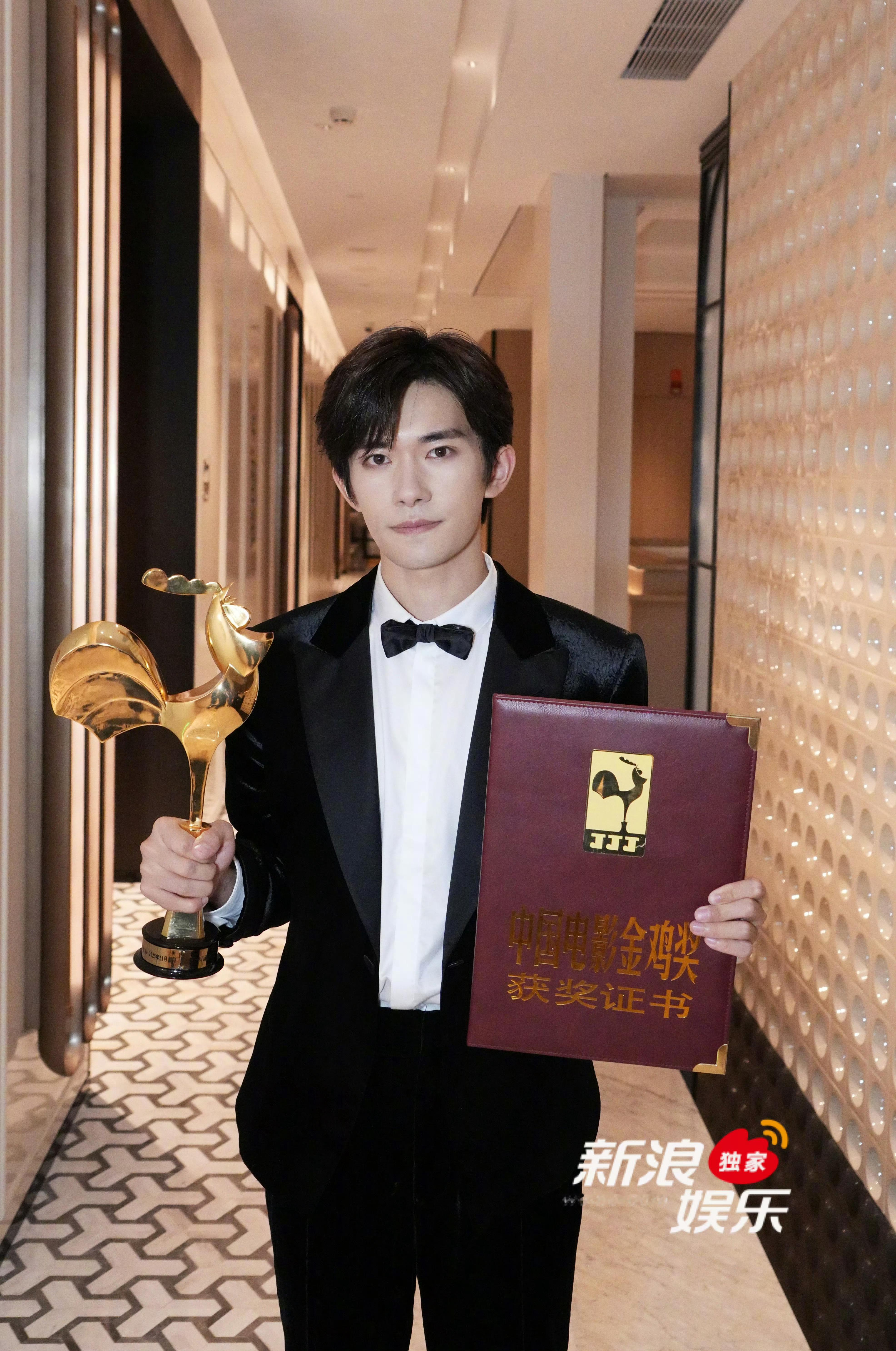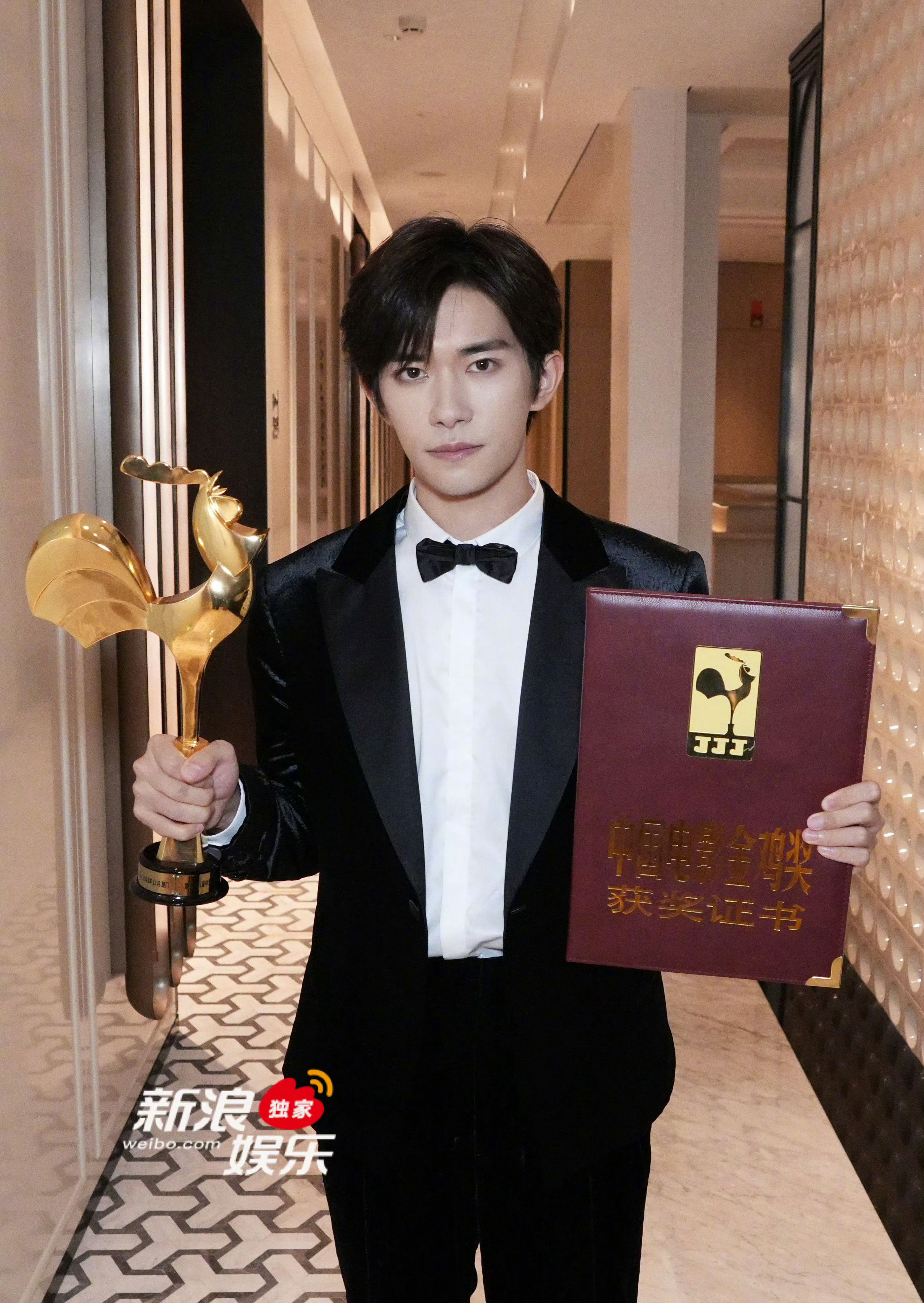 易烊千玺与自己的金鸡奖最佳男主角奖杯、证书合照,金鸡奖史上最年轻的影帝,期待未来