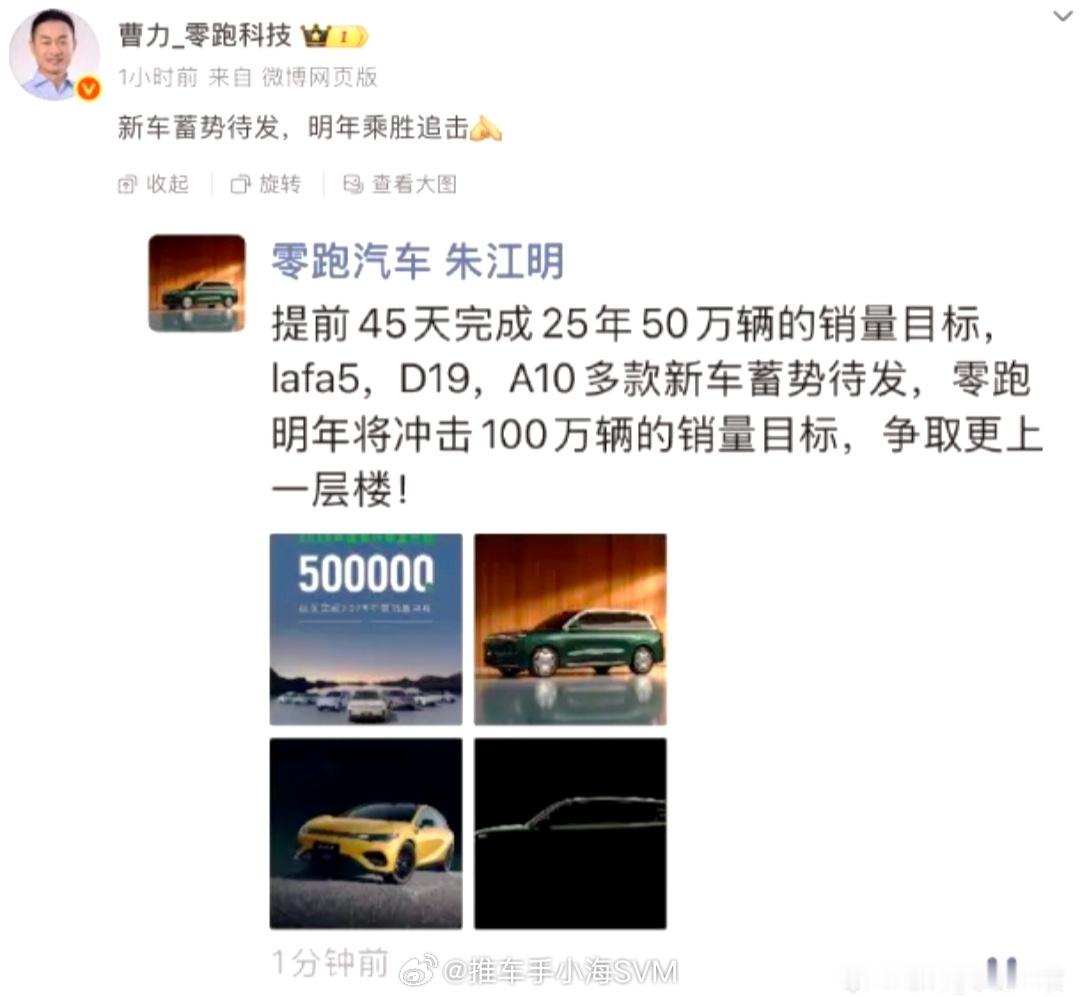 以前有多少人把零跑的目标当乐子看的?谁能想到真做到了呢?还是提前完成。2019年的时候,零跑就说,要在2025年做到年销50万辆电动车,实现盈亏平衡。当时有多少人嘲笑,一家名不见经传的新势力,说这种话简直就是在吹牛。或许很多人已经记不清2019年的情况了,来帮大家回忆一下。2019年,新势力销量冠军是蔚来,2019全年销量为20752辆,在造车新势力中销量排行第一。没错,就是全年销量,只有两万多辆,已经是第一。亚军是已经倒闭现在可能要重生的威马,2019年累计销售16683辆,在新势力中排名第二。小鹏全年以14191辆在新势力中排名第三位。这些全年销量,放到现在也就是一个月销量都不到。谁敢想,新势力在几年后如今的模样?更别说当时的零跑?你算哪根葱?看都看不见你!现在,零跑说明年要冲击100万辆的销量目标,大家还会不会嘲笑?万一真让他做到了呢?