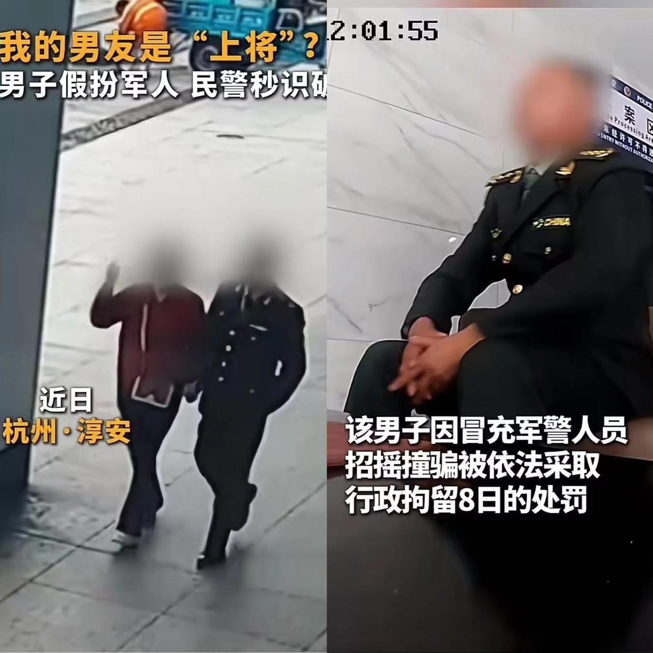 “没文化”连骗子都当不了 杭州淳安。有辆大巴车上 坐着个穿军装的"上将",旁边还带着 个女子。工作人员越看越不对劲,这位"上将"一举一动完全不像那么回事,赶紧悄悄报了警。 民警到场立马识破:我国现役上将最少都60岁以上,出行必有警卫随行。可眼前这位,年纪轻轻,举止轻浮,破绽百出。 好笑的是,当民警要带走调查时,同行的女子还不服气:"我男友是上将!"结果一查,这位何某就是个冒牌货,最终因冒充军警人员被刑拘8天。 网友都乐了:全国现役上将才36人,这位是把自己当第37个了?还有人说,这就像造假币造了个500面值的,太离谱!