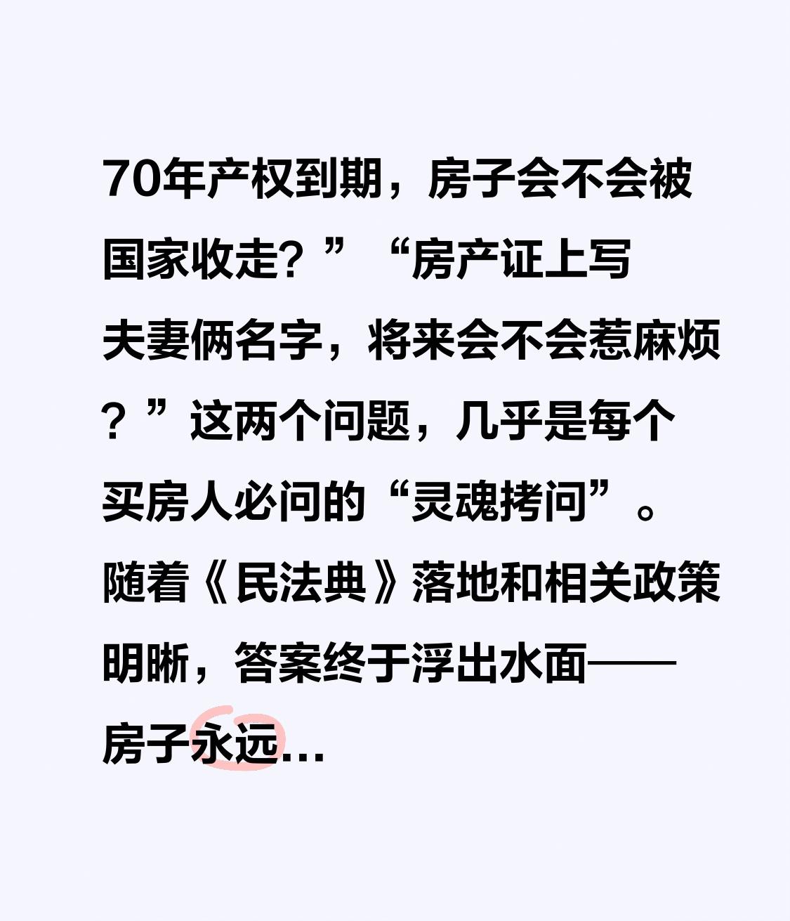 70年产权到期,房子会不会被国家收走?”“房产证上写夫妻俩名字,将来会不会惹麻烦?”这两个问题,几乎是每个买房人必问的“灵魂拷问”。 随着《民法典》落地和相关政策明晰,答案终于浮出水面——房子永远是你的,但“署名”有学问! 先来说说70年产权到期的事儿。 其实,70年产权指的是土地使用年限,而房子作为我们的私有财产,其所有权是永久的。根据《民法典》规定,住宅建设用地使用权期限届满的,自动续期。 续期费用的缴纳或者减免,依照法律、行政法规的规定办理。这就意味着,70年产权到期后,房子不会被国家收走,我们只需按照规定处理土地使用续期问题,就能继续安稳地住在自己的房子里。 再聊聊房产证“署名”的学问。房产证上写夫妻双方名字,看似是爱意和信任的体现,但在一些情况下可能会引发不必要的麻烦。 比如,如果夫妻双方感情出现问题,涉及到房产分割时,情况就会变得复杂。 而且,在购房政策方面,有些地方对家庭房产套数有限制,如果房产证写了两人名字,后续再买房可能会受到影响。 所以,在署名时,夫妻双方要综合考虑家庭情况、未来规划等因素,做好抉择。 总之,了解这些知识,能让我们在买房这件人生大事上少走弯路,住得更加安心。