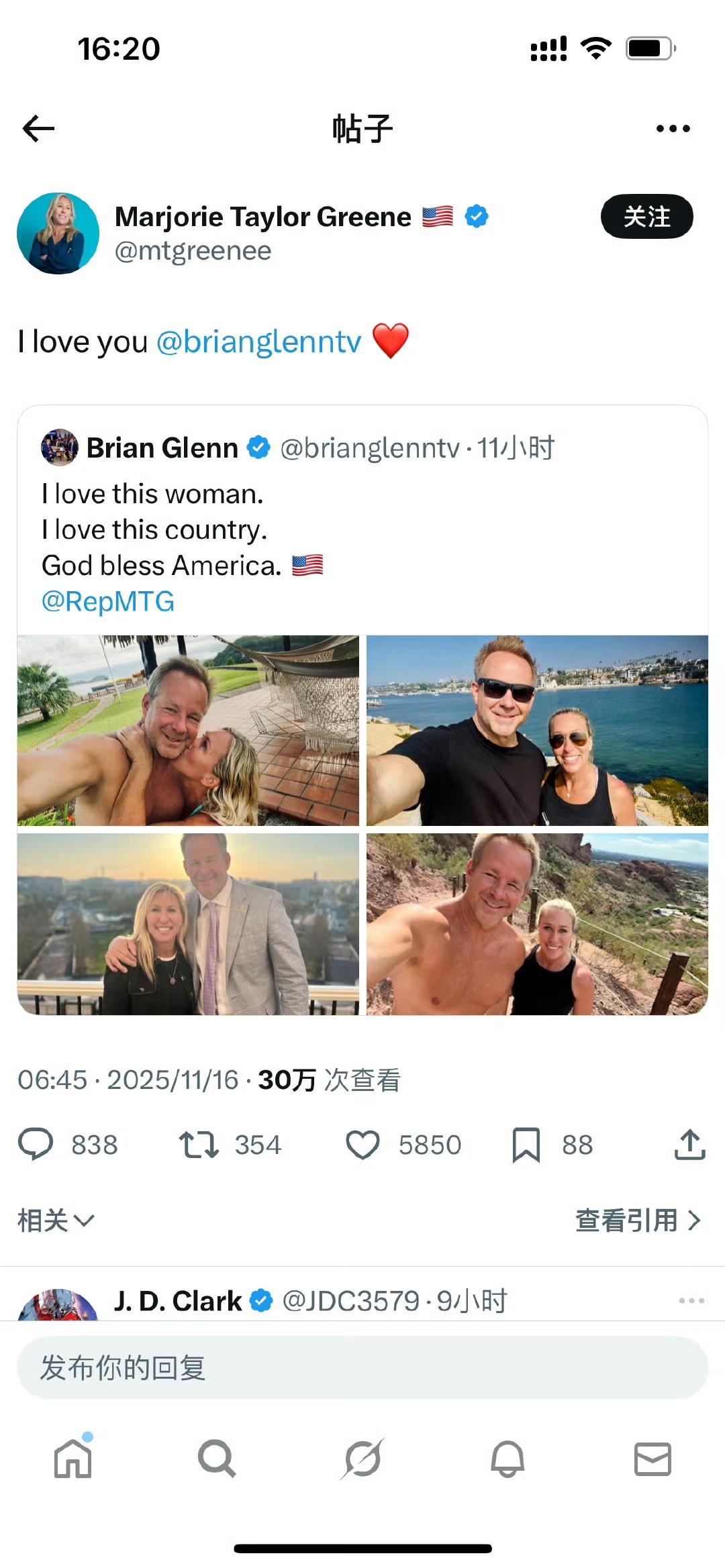 还记得这哥们吗?就是在白宫质问泽连斯基为什么不穿西服的那位,Real America’s Voice的白宫首席记者,Brian Glenn,他还有一个身份是MTG的男朋友,两人几乎同时离婚,已经交往三年,被保守派称为“MAGA最受欢迎情侣”,自己也积攒了30多万铁粉。现在女友MTG与特朗普翻脸,他昨晚公开表白支持女友,MTG转发。 他以后何去何从呢?想想就尴尬啊! Brian Glenn顶着“白宫首席记者”的名头,没见他问过多少正经民生问题,倒先把自己活成了MAGA圈的“恋爱博主”,靠着MTG男友的身份圈粉30万,连职业底线都快蹭没了。 现在女友跟特朗普翻脸,他跳出来表忠心,看似“情比金坚”,是不是押错了宝呢? MAGA圈里哪有什么真感情? 他可是个记者,不是饭圈粉头!拿着话筒不追问政策对错,倒把职场变成情侣的“应援现场”,连基本的职业中立都丢了。往后特朗普那边肯定容不下他,MTG要是失势,他这“情侣流量”也没了。到时候既没了记者的体面,又丢了圈粉的噱头,可不就是自找的尴尬? 注:本文信息源于网络,内容仅为个人观点,无不良导向。