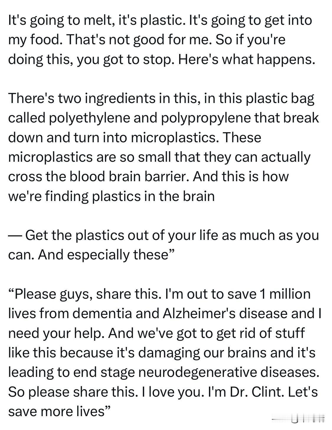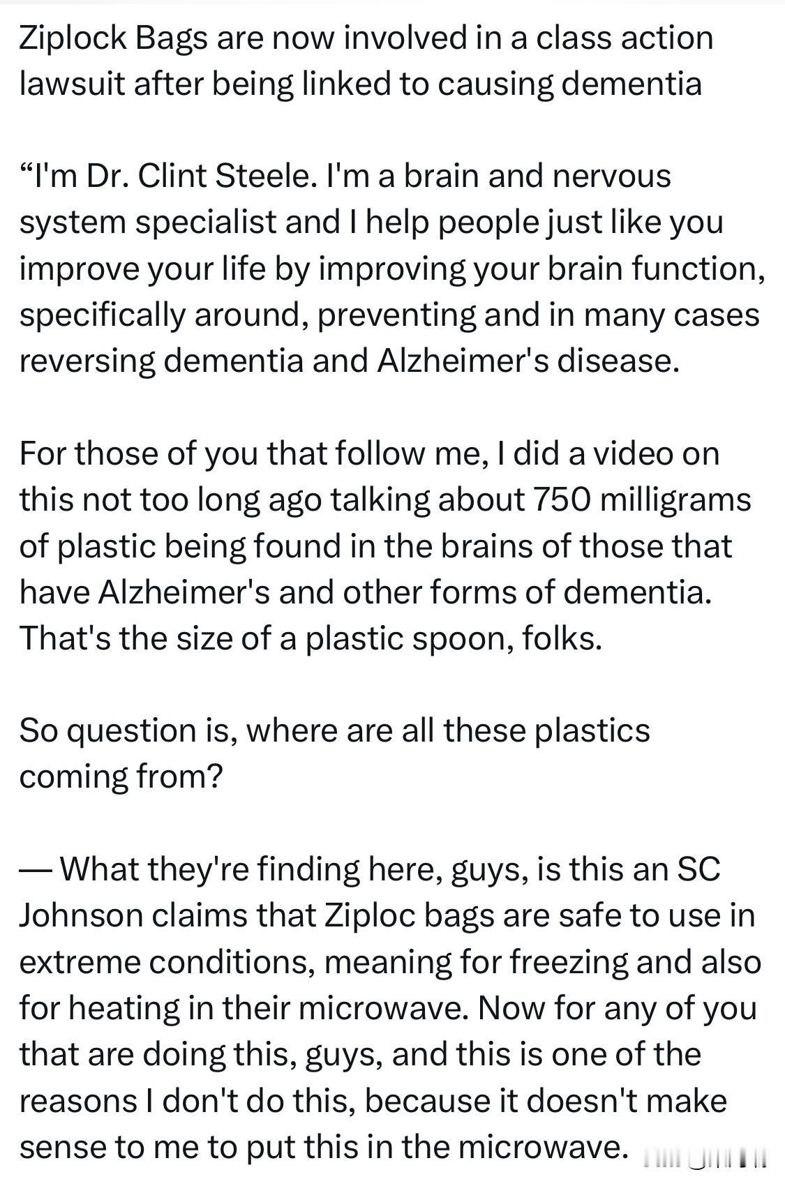 美国加州居民琳达·切斯洛(Linda Cheslow)领衔的集体诉讼近日正式递案,指庄臣(SC Johnson)生产的Ziploc标示不实,号称「微波炉安全」、「冰箱可用」,但原料在微波与冷冻时,却会释放塑胶微粒与奈米微粒,长期使用会导致癌症、失忆症、心血管疾病与生殖功能异常等。 诉状中列出的产品包括,「Ziploc Freezer Bags」、「Slider Freezer Bags」、「Slider Storage Bags」与「Ziploc Containers」,号称「微波炉安全」与「冰箱可用」。 该案将于2026年初开庭。值得关注。 逆转痴呆和阿尔茨海默病专家克林特·斯蒂尔博士(Dr. Clint Steele):患有阿尔茨海默病及其他痴呆症患者的大脑中发现了 750 毫克的塑料——差不多相当于一把塑料勺的重量。 问题是,这些塑料到底来自哪里? —— 研究显示,这些塑料可能来自 S.C. Johnson 声称可在极端条件下使用的 Ziploc 塑料袋,即冷冻或微波加热。如果你在这么做,请立即停止。 —— 塑料袋中主要成分聚乙烯(polyethylene)和聚丙烯(polypropylene)在高温或冷冻条件下会分解,产生微塑料。这些微塑料非常微小,可以穿过血脑屏障,从而进入大脑。 —— 尽量从生活中减少接触这些塑料,尤其是这种类型的塑料。