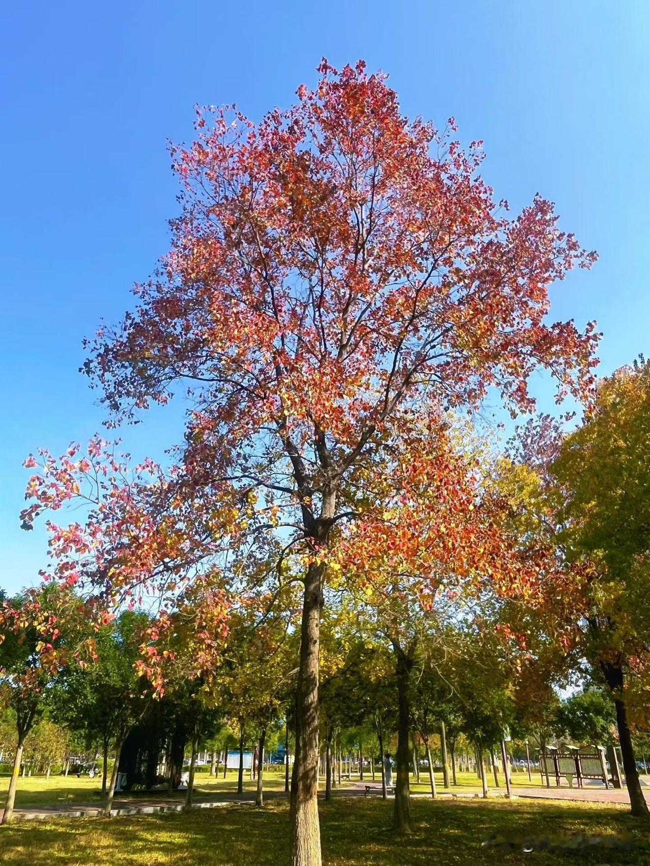 瞧,公园里的这棵树也太会“打扮”了吧!蓝天底下一身红橙渐变,像把秋天的颜料盘都泼身上了。 风一吹叶子晃啊晃,阳光钻进来碎成星星点点,落在草地上暖乎乎的。旁边黄绿的树凑过来,跟它搭成了最靓的秋日CP。 这时候慢悠悠逛着公园,踩着软乎乎的草,抬头看这树像团烧得正好的火苗,连空气都裹着甜丝丝的秋味儿。