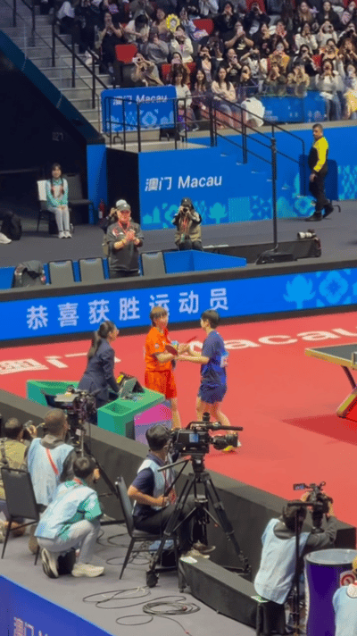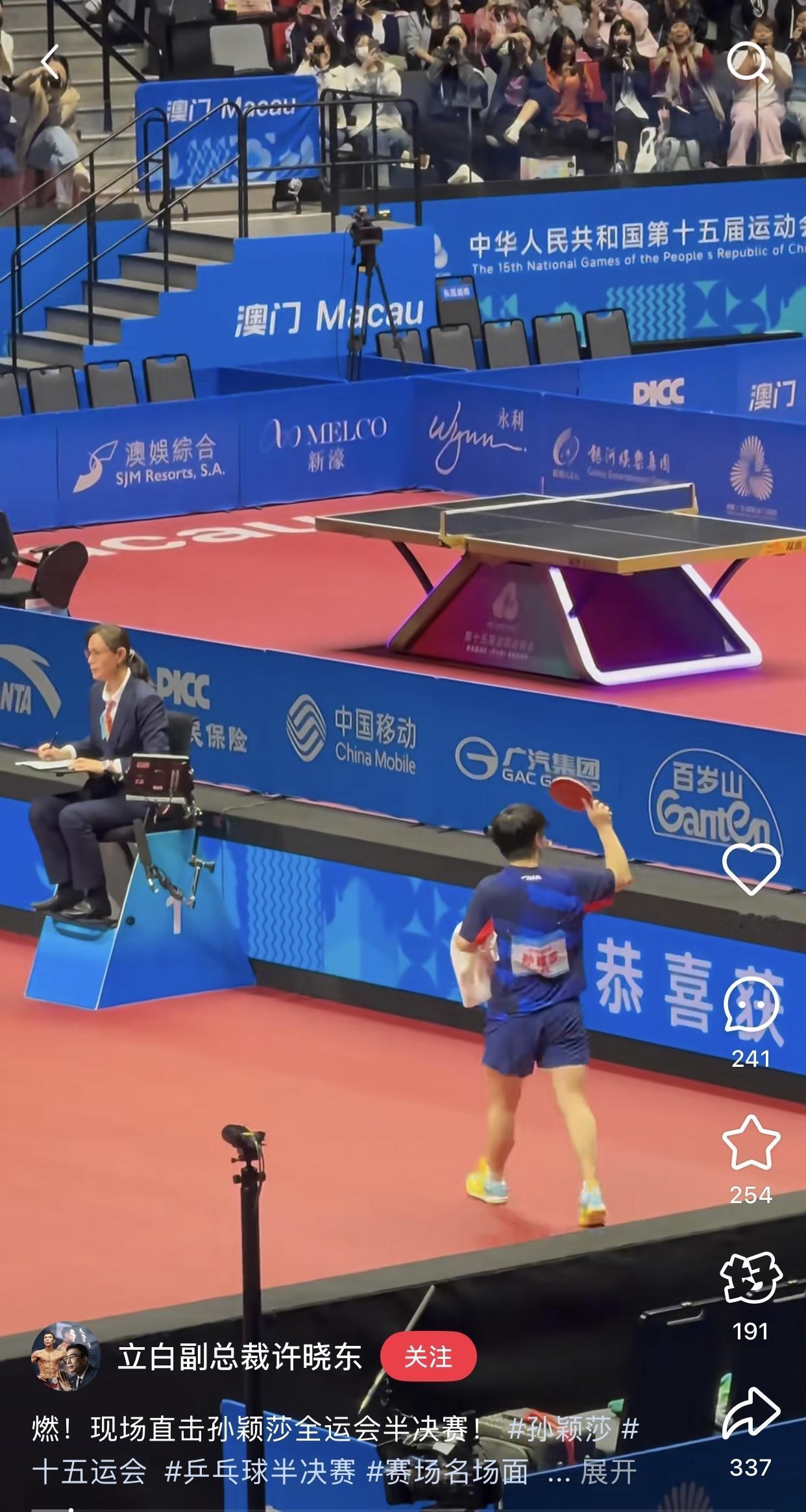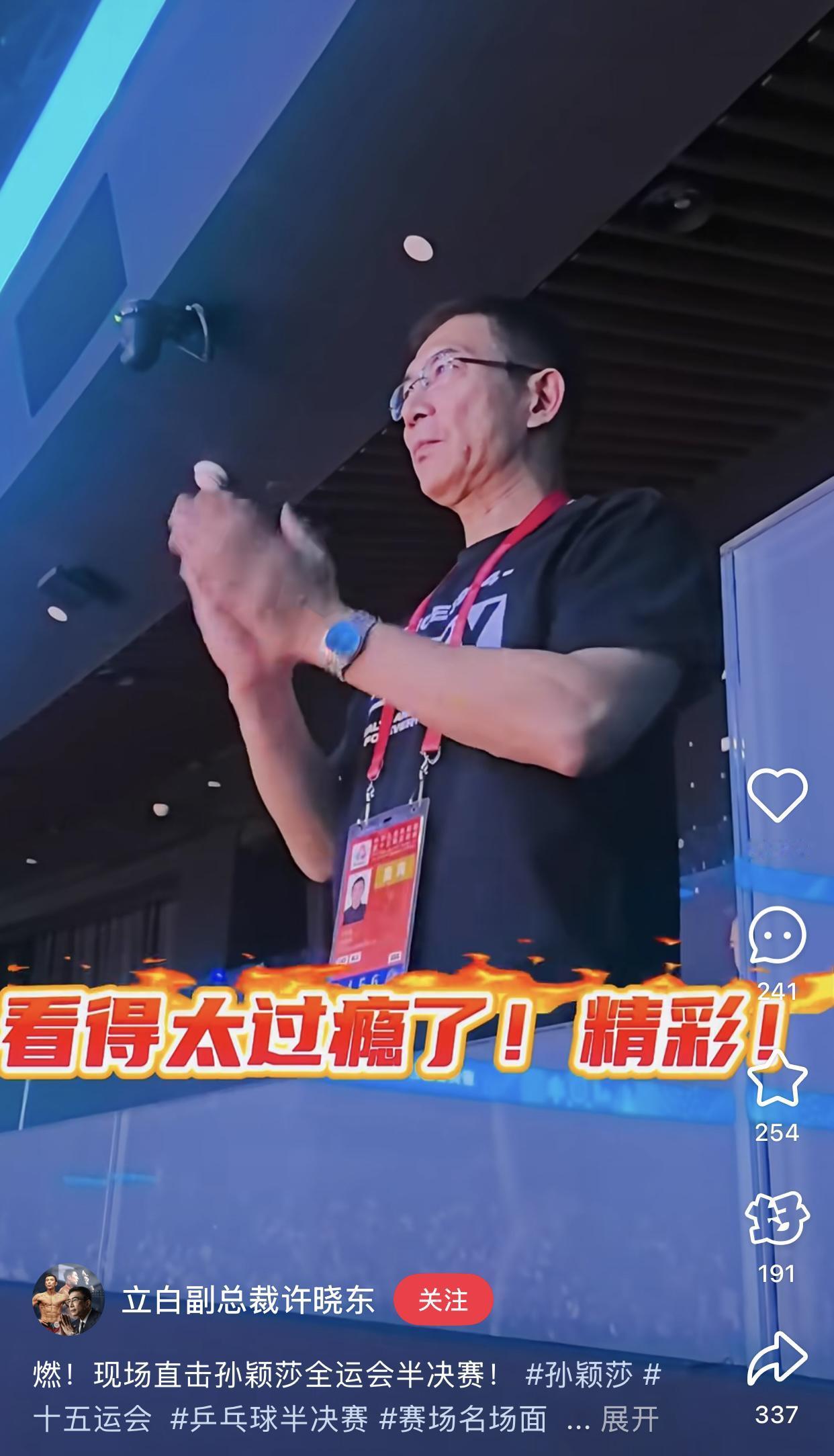 集团副总裁许先生亲自到现场为孙颖莎加油。 许先生发布了一个视频,封面就是“恭喜莎局”, 自己站在看台给莎莎鼓掌的视频也在。 所以喜欢她的人真的很多,各行各业的都有, 当然各行各业的精英也自然都被涵盖。 因为她的人,她的球,而去支持她。 因为她的责任感和荣誉感,她的格局, 她的个人魅力,而去喜欢她! 莎莎决赛加油哦。