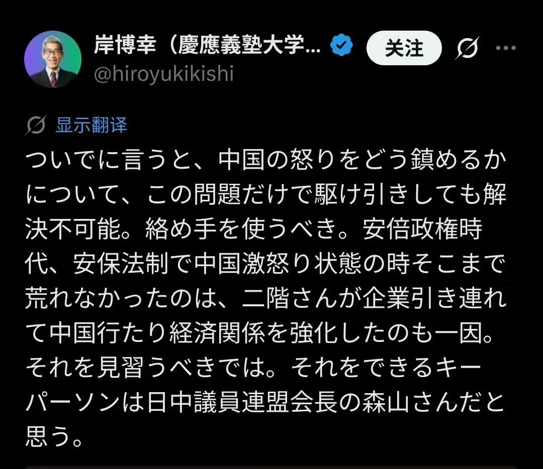 这回不是钱的事!中日关系紧张日本学者建议:学安倍当年的做法 因为高市早苗的涉台言论,目前我国和日本之间的关系持续紧张。在这种情况下,日本国内的一些学者也已经意识到这种情况。如果一直进行下去的话,对于日本肯定会有越来越明显的负面影响以及相应的损失。所以他们也纷纷发表自己的观点和相应的建议。 日本学者岸博幸近期提出了一个建议,说当下,如果想要平息中国的怒气,光依靠在单一问题上讨价还价,根本没办法解决。日本应该采用迂回解决的办法。也就是学习一下2015年安倍晋三在处理中国强烈反对日本安保法时的做法:迅速派代表团访问中国,以加强经济交流,增加合作项目为诱惑,让中国减弱对于日本的外部压力。并且指出当下日本最适合承担此事的是日中议会联盟会长森山先生。 这位日本学者的建议,在我看来绝无可能,所谓经济合作,无非就是涉及到利益,涉及到金钱,但实打实的说,这件事情根本就不是钱的事。 首先是,这次高市早苗是直接干涉了我们的内政,性质严重的多。其次是,现在中日两国的经济情况和10年之前的安倍时代已经发生了天翻地覆的变化。今天的中国经济对于日本的依赖,早就已经大幅度下滑,日本经贸合作对于我国来说没有足够的吸引力。 日本当下要解决问题的最优办法,就是抓紧时间用最诚恳的态度道歉,并且明确表态以后不会再犯。只有这样才有可能获得我国的谅解,其他的办法,没有什么用处。