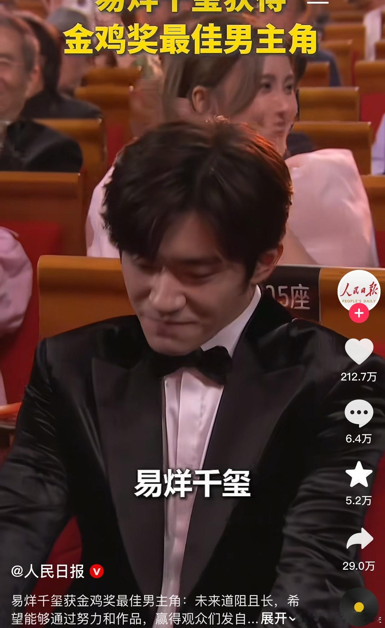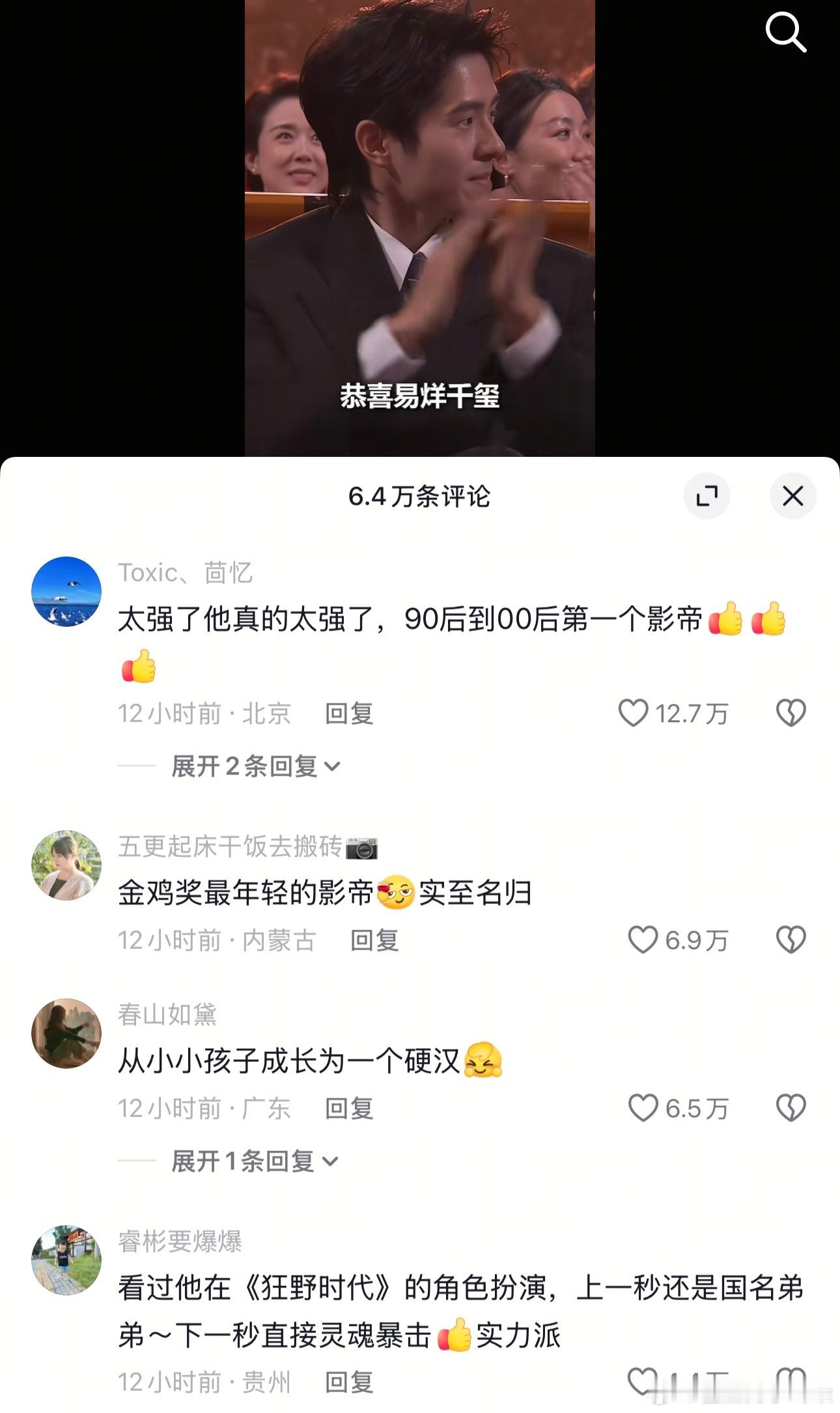 易烊千玺拿金鸡影帝,几百万的数据全部在恭喜他,评论区也是一片恭喜声。