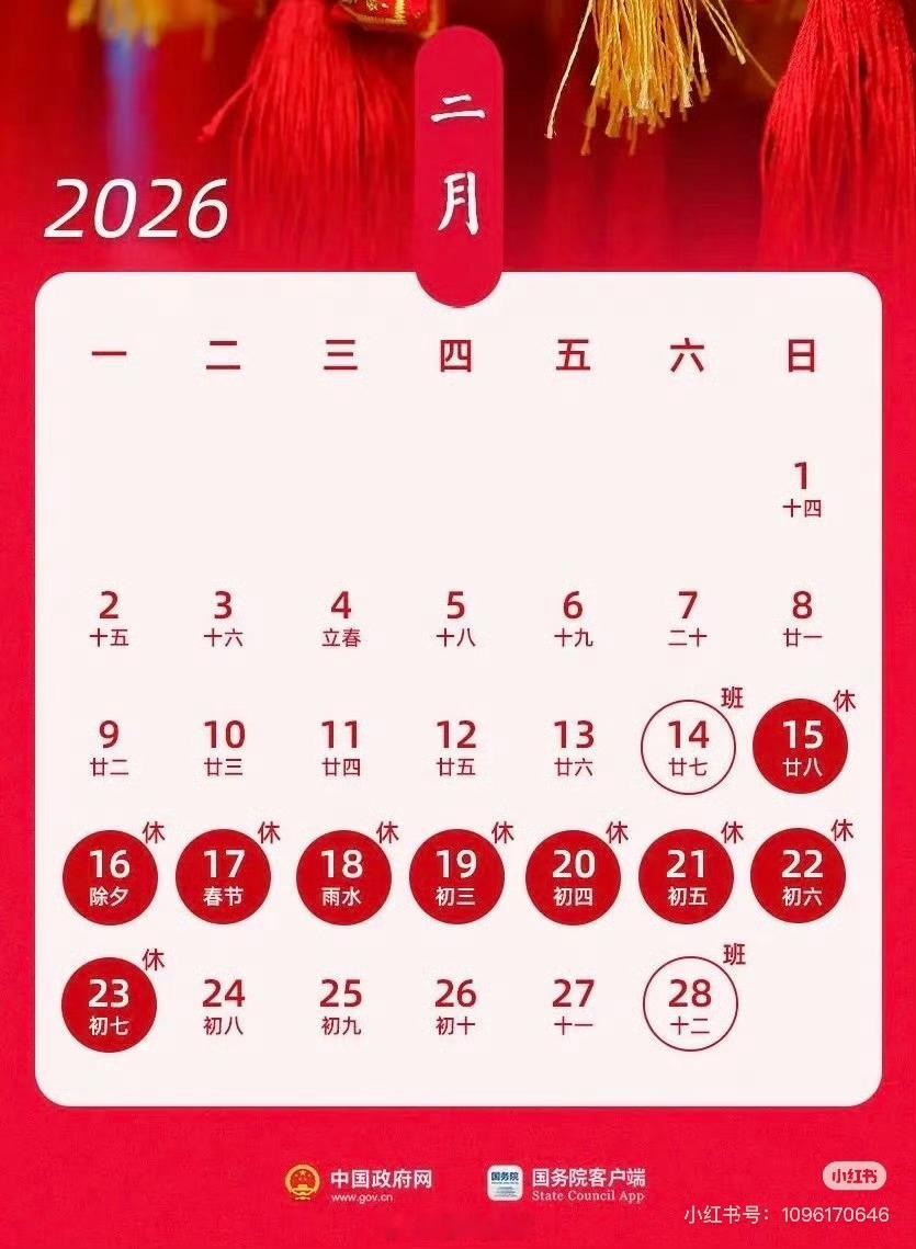 2026年的2月16日才是除夕,然后开始春节假期。虽然15日-23日连休9天,但