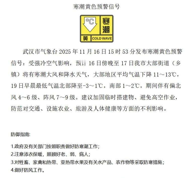 10级!这波太猛!今晚抵达武汉。18—19日早晨,是本轮寒潮“谷底”,武汉北部最低气温可达-2~1℃、南部1~2℃,部分区域可见霜染枝叶。武汉秋天的树是自成一派的画 降温,喝完藕汤暖暖吧