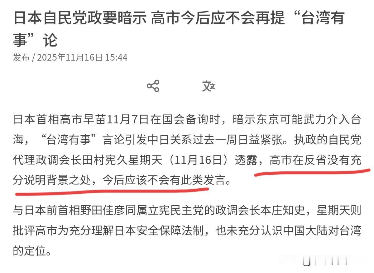 高市早苗态度变软了,找人给中方喊话,希望中国给一个台阶下!在我们多方严厉警告,要求高市早苗撤回恶劣言论之后,日本政府终于意识到事态严重性了。11月16日,根据外媒报道,因高市早苗言论引发中日关系急剧紧张之后,执政的自民党代理政调会长田村宪久出来放消息了。田村宪久称,高市在反省没有充分说明背景之处,今后应该不会有此类发言。 很显然,在日本政府最少两次表示不撤回相关言论之后,这一次,日本方面口风有变化了。常理推断,田村宪久如果没有得到授意,恐怕也不会出来释放这一个消息。某种程度来说,日本是希望通过软化立场,让我们给高市早苗一个台阶下,给当下两国的紧张关系降温。 不过,日本态度有软化,但是在我们看来其缓和关系的诚意明显不足。日本方面称,高市在反省没有充分说明背景之处,今后应该不会有此类发言。但是,问题仅仅是所谓的“没有充分说明背景之处”吗?我们的回应如此强烈,高市早苗却公开表示不撤回,其挑衅嘴脸,分外明显。如果这只是考虑欠妥的失言,高市早苗为什么拖到现在还不撤回? 日方称“今后应该不会有此类发言”,其立场仍非常的模糊,高市早苗是不是应该自己亲自站出来把其对台湾问题上的态度讲清楚。如果以为这样作出缓和姿态,我们会放过,那高市早苗是打错了算盘。在我们这里,高市早苗正确的立场只有一个,那就是严格遵守一个中国原则,反对“台独”,彻底的抛弃任何台湾有事,日本有事的念头。否则,我们将继续以我们的方式,让日本改变错误立场。