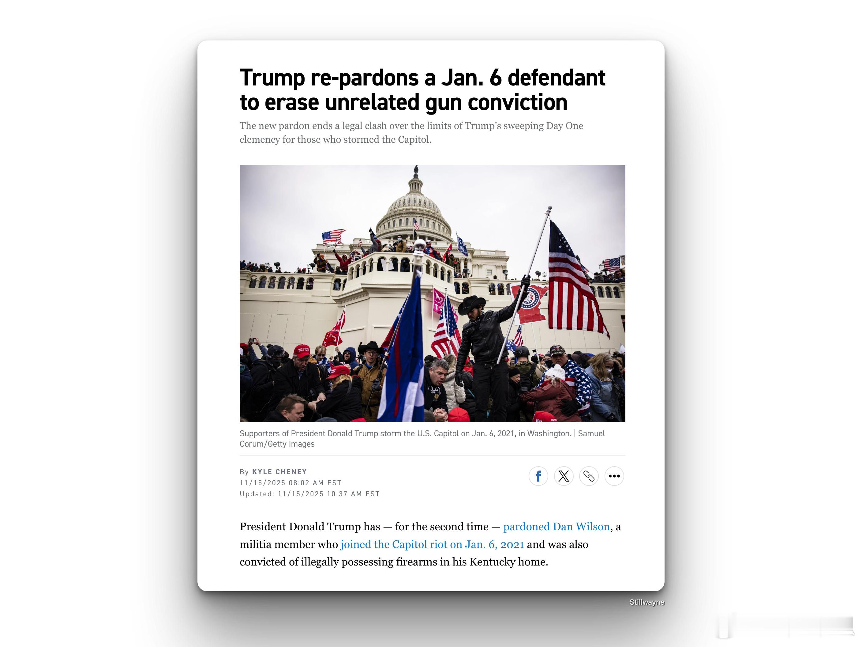 特朗普第二次赦免了“1月6日国会暴乱”参与者丹·威尔逊此前,威尔逊已在特朗普就职日获得针对参与暴乱的赦免,但仍因其他罪行服刑。如今,特朗普再次赦免了他因非法持枪所受的联邦重罪判决。白宫官员解释了特朗普赦免的理由称:如果没有 1 月 6 日的大规模调查,就不会发现他持有“未经授权的枪支”。