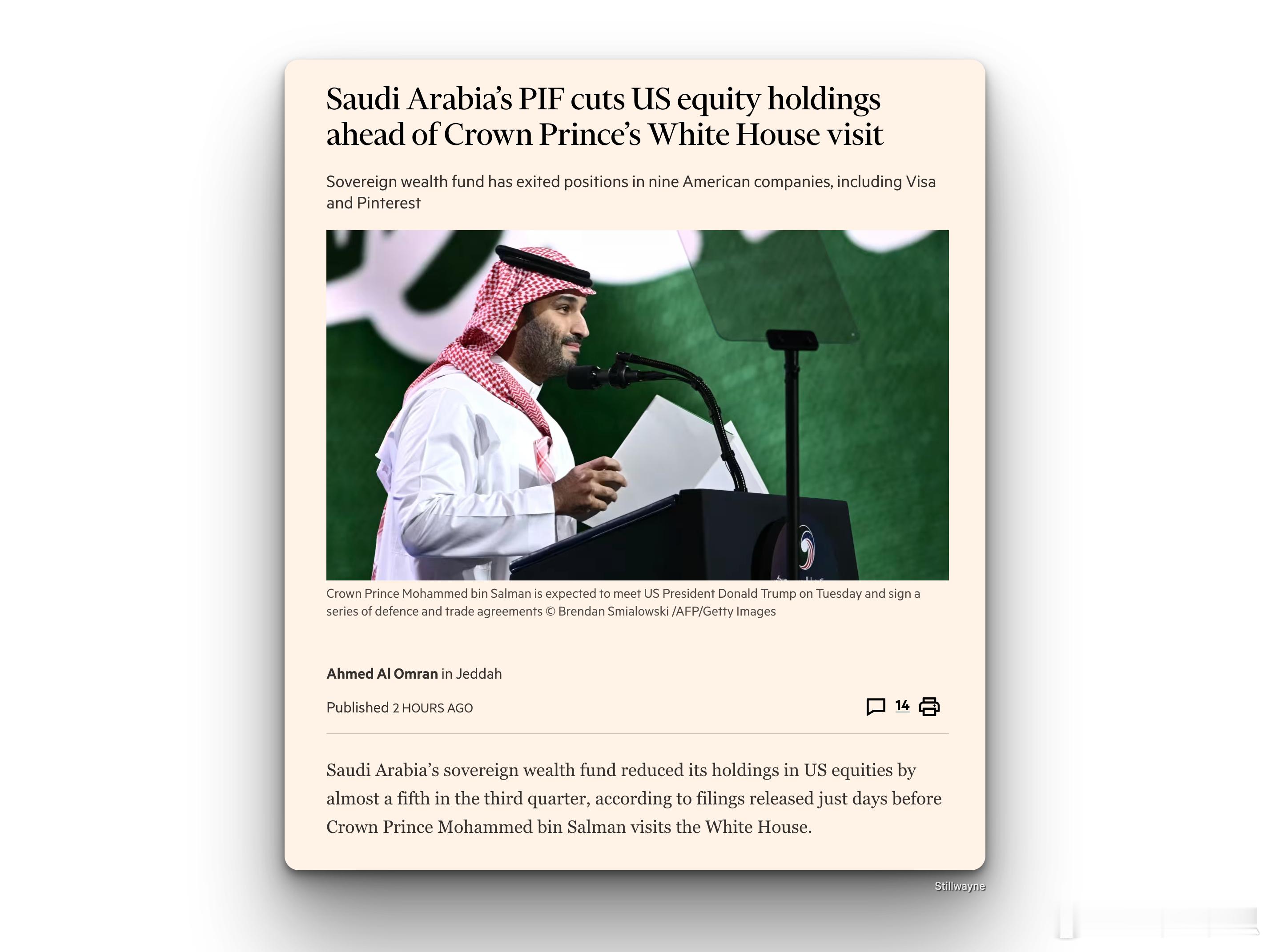 沙特阿拉伯公共投资基金(PIF)在萨勒曼访问白宫前减持美国股票。在王储穆罕默德·本·萨勒曼访问白宫前,沙特阿拉伯主权财富基金公布在第三季度将其在美国股票的持股比例减少了近五分之一。这家沙特国家主权基金清仓了包括 Visa 和 Pinterest 在内的九家公司的股份,与第二季度相比,其对美国股票的投资减少了 18%。------------------这种操作很可能就是把原本就在美国的部分投资撤出,然后在与特朗普会谈的时候承诺再把这些钱投资到美国...让大统领吹个牛逼。
