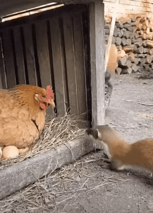 家中母鸡正专心孵蛋, 黄鼠狼偷偷逼近。 危急时刻,猫咪飞身扑出 一把按住不速之