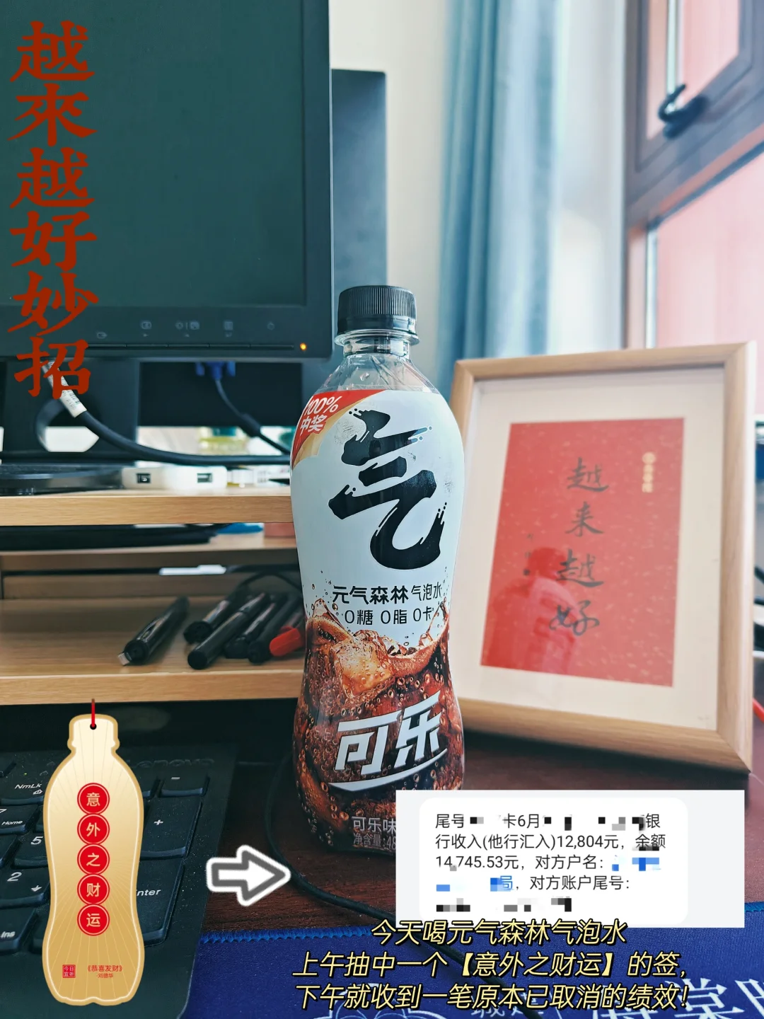 人在高配得感和自信的状态下会做事更顺利。因为美好的事情会流动、传递。像我今天喝元气森林百分百中奖气泡水,抽中个【意外之财运】的签,下午就收到一笔绩效这回事,感觉像是抽到了好运签带给我了积极状态,让高能量流动了起来。