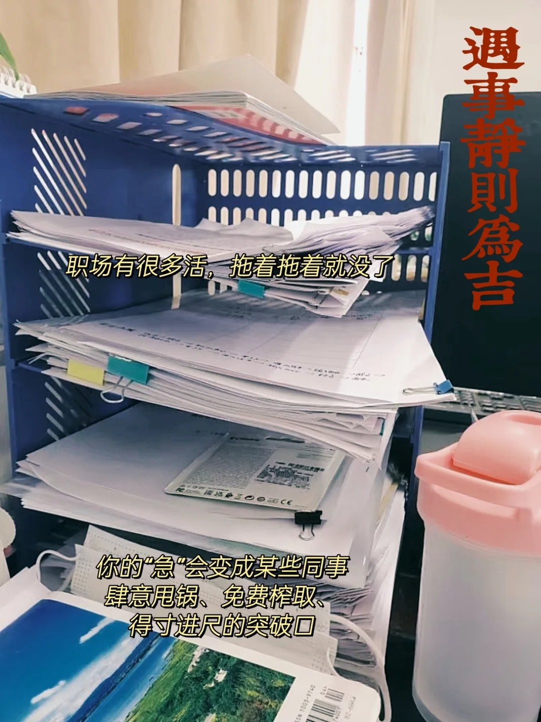 职场上有很多活,拖着拖着就没了。遇到事情千万别急。人缓则安状态下你会想出更合适的处理办法。工作中你的“急”会变成某些同事肆意甩锅、免费榨取、得寸进尺的突破口。要愉 悦、高 效且边界清晰的完成工作,才能把健康还给身体,周末还给生活,好运回归自己。