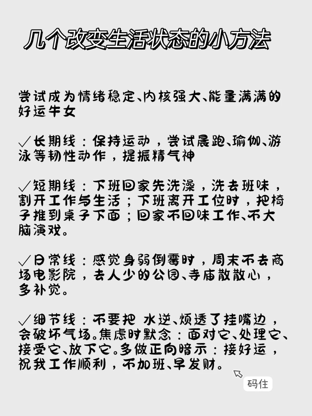 ✓细节线:不要把 水逆、烦透了挂嘴边,会破坏气场。焦虑时默念:面对它、处理它、接受它、放下它。多做正向暗示:我会工作顺利,不加班、早发财。