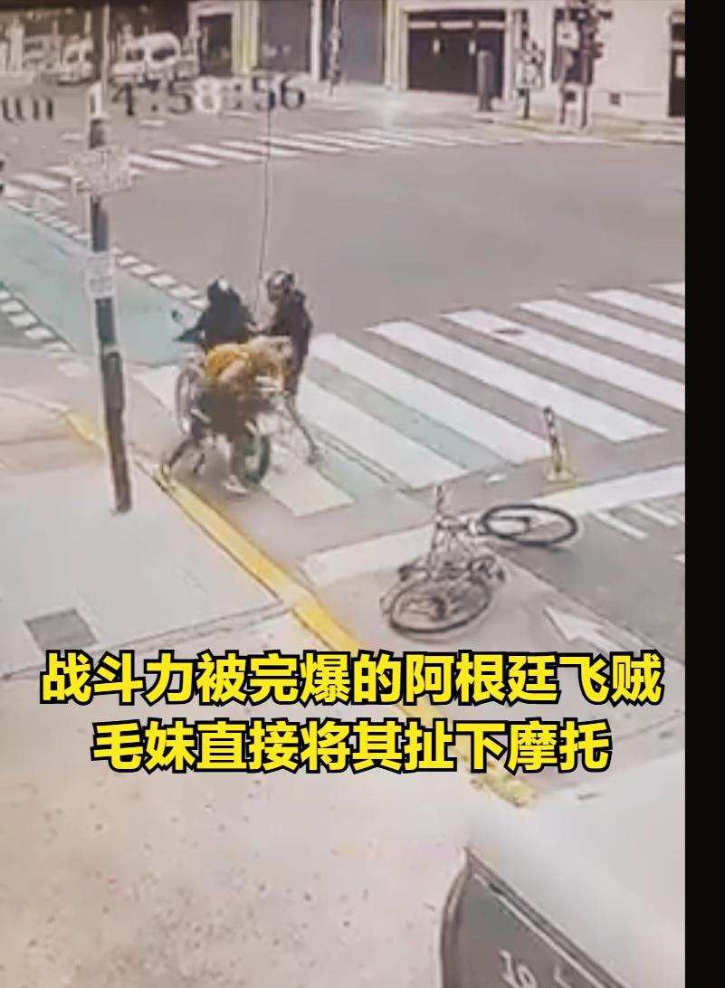 阿根廷摩托飞贼遇到了硬茬: 俄罗斯女游客骑自行车在阿根廷首都布宜诺斯艾利斯的巴勒莫街区观光中。两名阿根廷飞车贼从她后面慢慢接近,趁她等红灯时想突然牵走她的手机。 毛妹就是毛妹,再一次证明了战斗力远超阿根廷女娃。这位毛妹临危不乱,一把抓住飞贼的腿,把他从车上拽了下来。她控制住男子直到人员赶到,但另一名同伙却逃脱了。后续就是这群团伙被顺藤摸瓜一锅端掉。