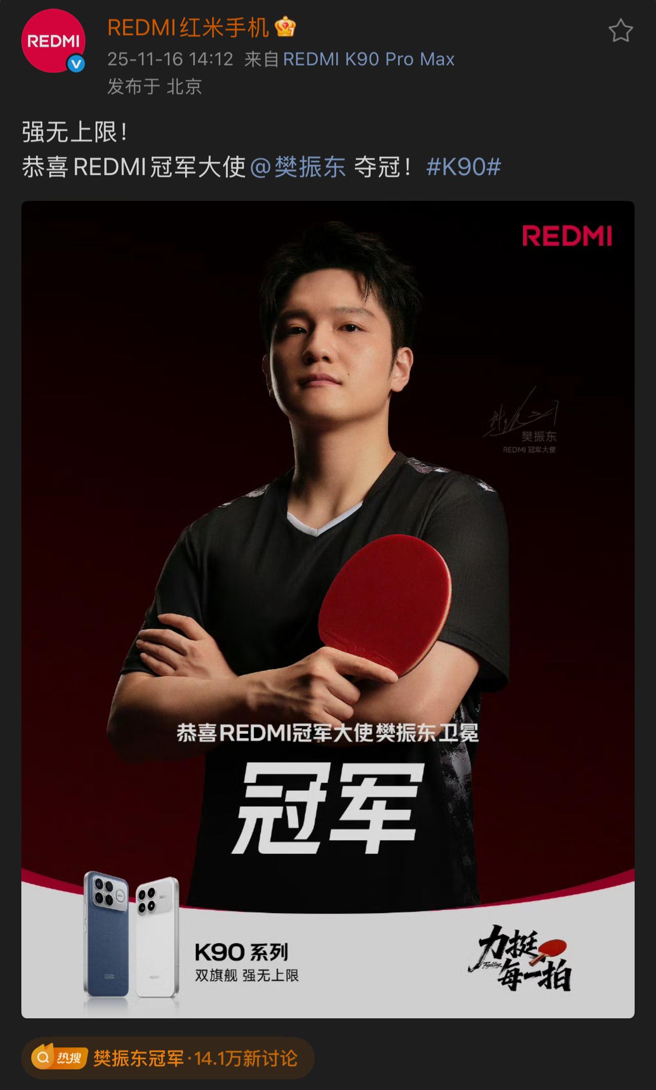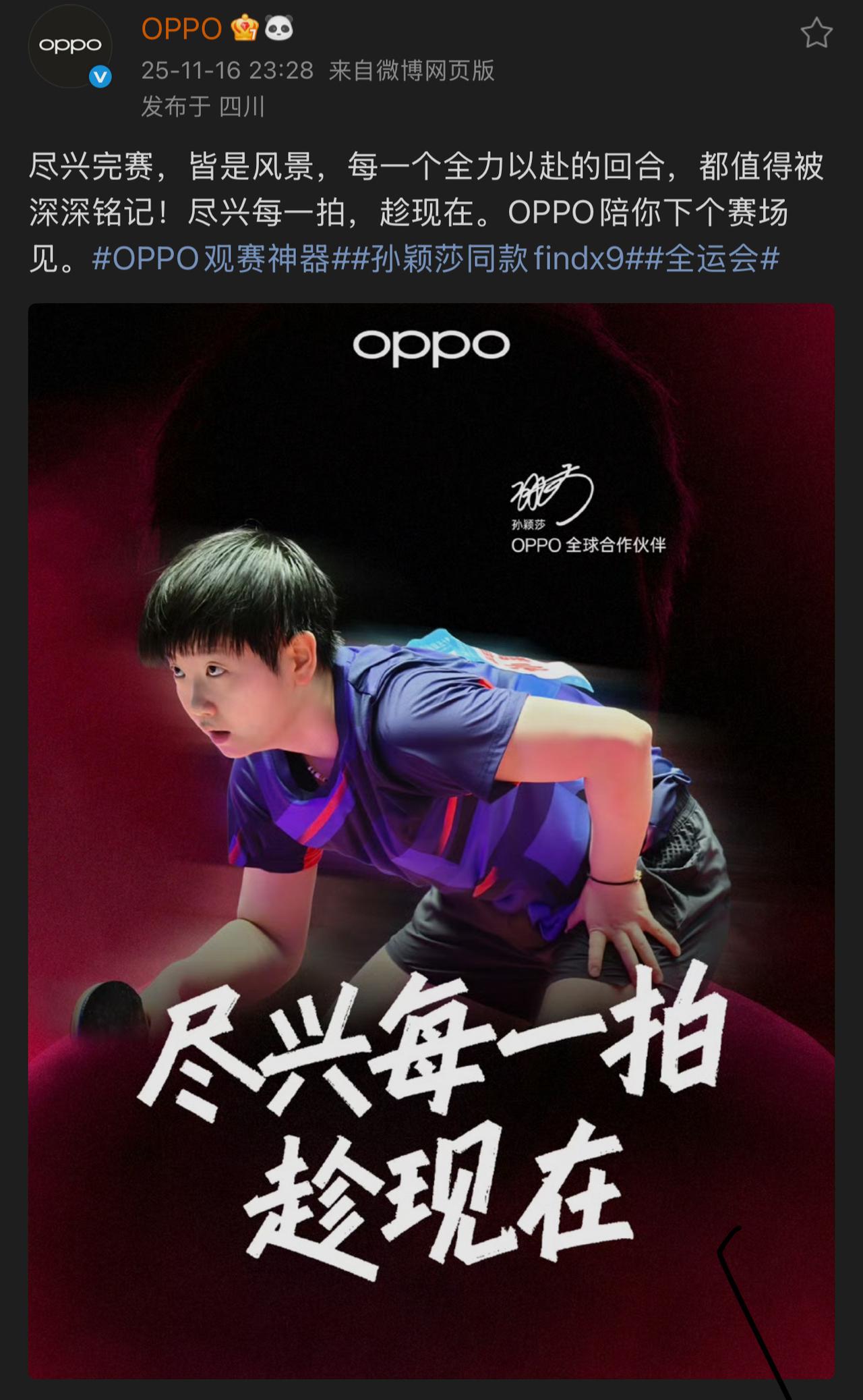 今年全运会,两家国产手机品牌代言人樊振东和孙颖莎都取得了给力的成绩,樊振东勇夺金牌,孙颖莎获得银牌。