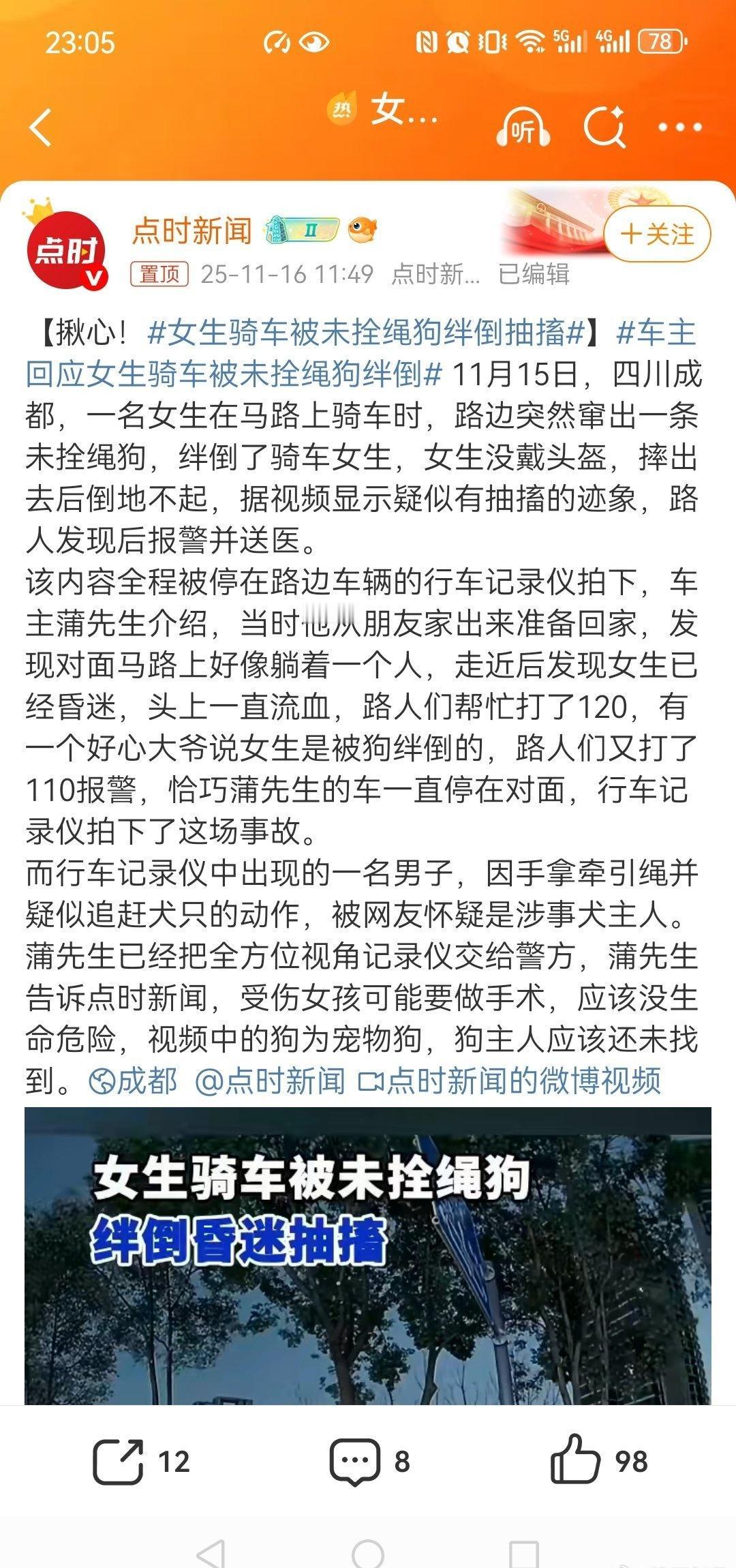 !女生骑车被未拴绳狗绊倒抽搐】车主回应女生骑车被未拴绳狗绊倒 狗主人是否应该被拘留呢,涉嫌以危险方法危害公共安全,明知道出门遛狗应该栓绳会有危险。却放任了这种行为。利用大数据和监控,抓紧找狗主人,另外该承担的民事责任一分不能少,并把狗主人的行为通报其单位、小区业主群等,让其行为曝光,成为典型案例。