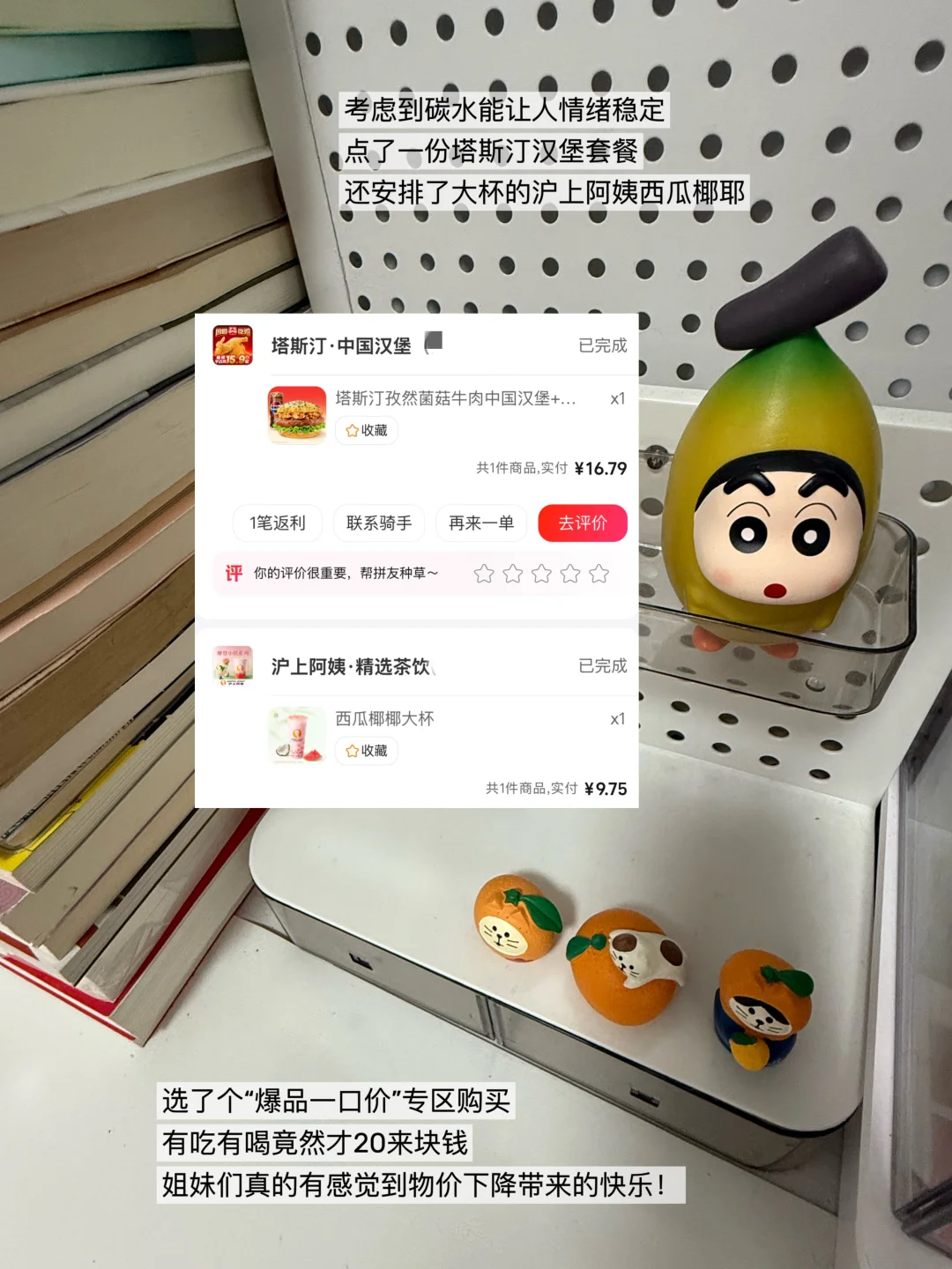 考虑到碳水能让人情绪稳定,点了一份塔斯汀汉堡套餐,安排了大杯的沪上阿姨西瓜椰耶。完事后突然罪恶感地想起妈妈多喝热汤的叮嘱,又点了份袁记。明明都是连锁品牌,选了个“爆品一口价”专区购买后,三份外卖竟然才30多块钱[哇R]也就平常一份正常外卖的价格啊!太值了!眼瞅着和一个个蓝天碧水、大鹏展翅的头像拼单成功后,我就昏昏沉沉睡过去了。