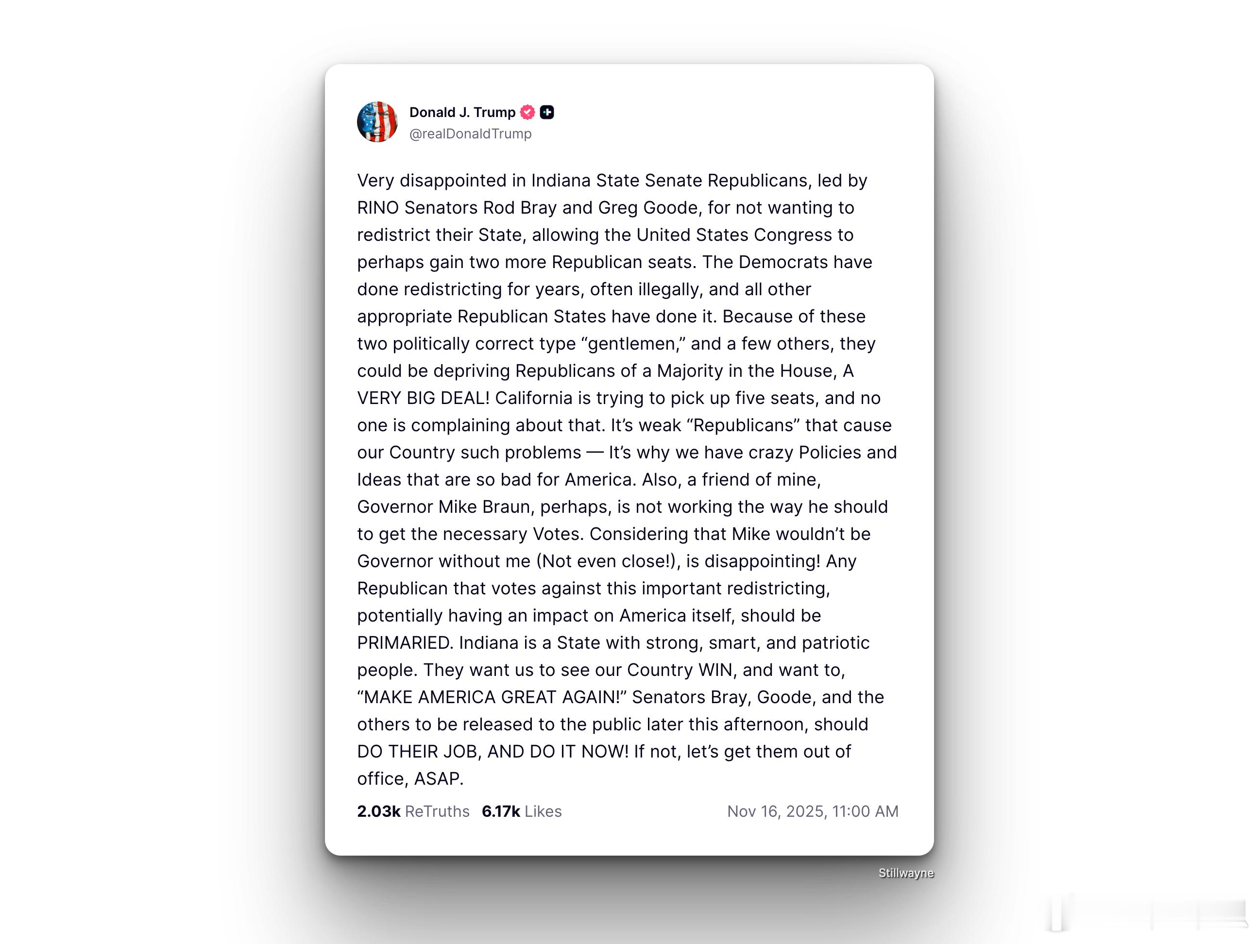 特朗普继续对不向他屈膝的共和党人发出威胁:“把他们从公职上赶走!”。--------------------“我对印第安纳州参议院的这些共和党议员非常失望,尤其是由两个“挂着共和党牌子的假共和党人”罗德·布雷和格雷格·古德带头的那些人。他们居然不愿意重新划分州内的选区。如果重新划分,很可能能让美国国会多出两个共和党席位。民主党这些年一直在重划选区,很多时候甚至是违法地操作。而其他合适的共和党州也都做了重划。结果就因为这两个追求“政治正确”的家伙(还有一些其他人),共和党可能因此拿不到众议院的多数席位,这是非常严重的事!比如加州正努力通过重划选区多拿五个席位,却没有人对他们提出意见。真正导致美国这么多问题的,就是这些“软弱的共和党人”。正是因为这种人,我们才会面对各种乱七八糟、对国家有害的政策。另外,我的朋友、印第安纳州州长迈克·布劳恩,似乎也没有尽力去争取必要的支持。要知道,如果不是因为我,他根本不可能当选州长(差得远呢!)。所以他现在这个表现也让我失望。任何在这个关键的重划选区问题上投反对票的共和党议员,应该在初选中被“干掉”。印第安纳州的人民是坚强、聪明、爱国的。他们希望看到这个国家赢,希望看到“让美国再次伟大”。布雷、古德,以及今天下午会公布姓名的其他人,现在应该赶紧干正事,把重划选区的事情办好!如果他们不做,那就尽快把他们从公职上赶走。”