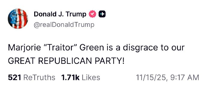 特朗普:玛乔丽·“叛徒”·格林是我们伟大的共和党的耻辱!