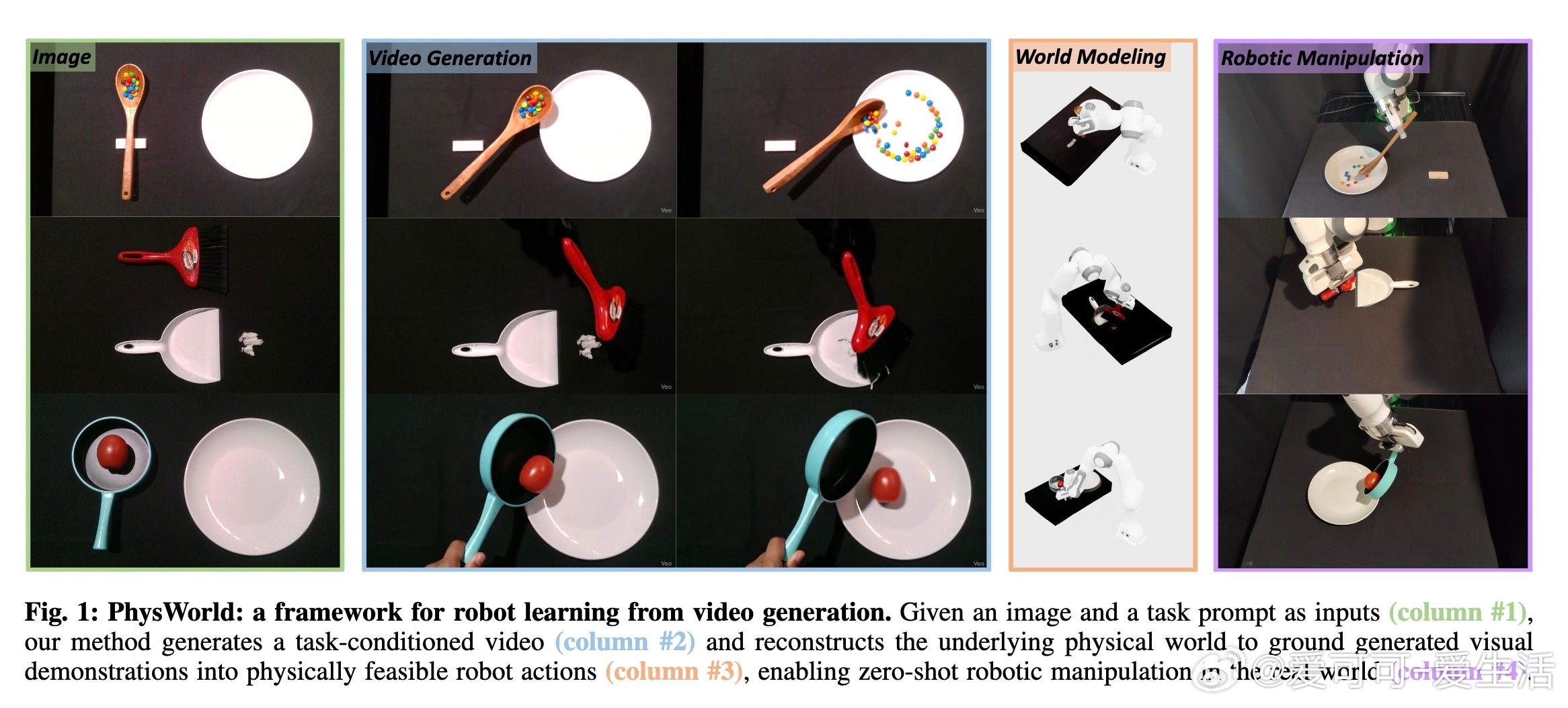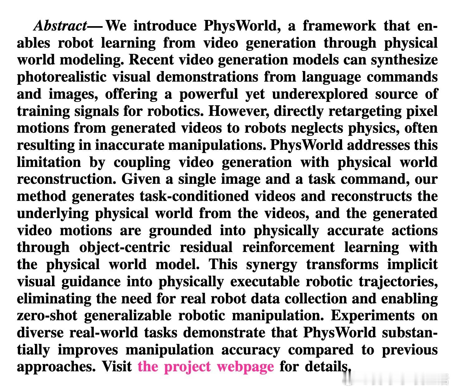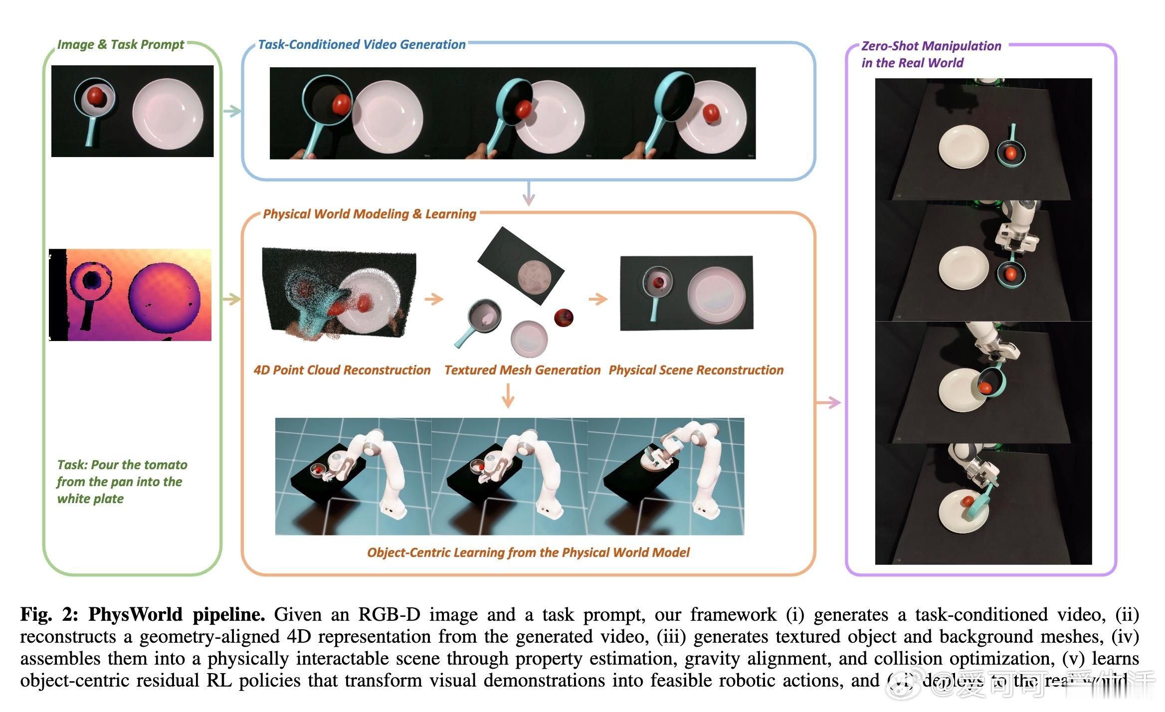 [RO]《Robot Learning from a Physical World Model》J Mao, S He, H Wu, Y You... [Google DeepMind & USC] (2025) 本文提出一种融合视频生成与物理场景重建的机器人零样本学习新框架,开辟机器人自主操控新路径。传统视频生成模型虽能根据图像和语言指令合成逼真示范视频,但直接将像素运动映射为机器人动作忽视了物理约束,导致操作误差大。PhysWorld创新性地从单张RGB-D图像和任务指令出发,先生成任务条件视频,再从视频构建4D时空物理场景,包括纹理网格、质量摩擦等物理属性,利用视觉语言模型辅助赋予物理参数,并通过碰撞优化确保场景物理合理。更关键的是,团队设计了基于物理世界模型的“对象中心残差强化学习”策略,聚焦对象运动轨迹作为学习目标,绕开了生成视频中常见的手部幻觉问题。该策略结合基线抓取与路径规划动作,学习残差修正,显著提升了策略收敛速度与鲁棒性,实现了无需真实机器人示范数据的零样本泛化操作。实验证明,PhysWorld在多样化真实任务(如倒番茄、放书入架、浇花等)中成功率达82%,较现有纯视觉追踪方法提升15%以上,有效减少抓取失败和运动追踪误差。通过对比多款视频生成模型,研究指出高质量、任务一致的视频生成是实现精确操控的关键。这项工作不仅打开了机器人学习利用大规模互联网视频生成模型的新思路,也为物理模拟与视觉生成的深度融合树立了标杆。未来,PhysWorld有望推动机器人自主适应复杂物理环境,摆脱昂贵示范采集限制,加速智能机器人在实际生活场景中的落地应用。详细内容请见:arxiv.org/abs/2511.07416
