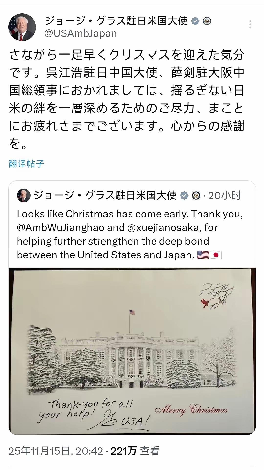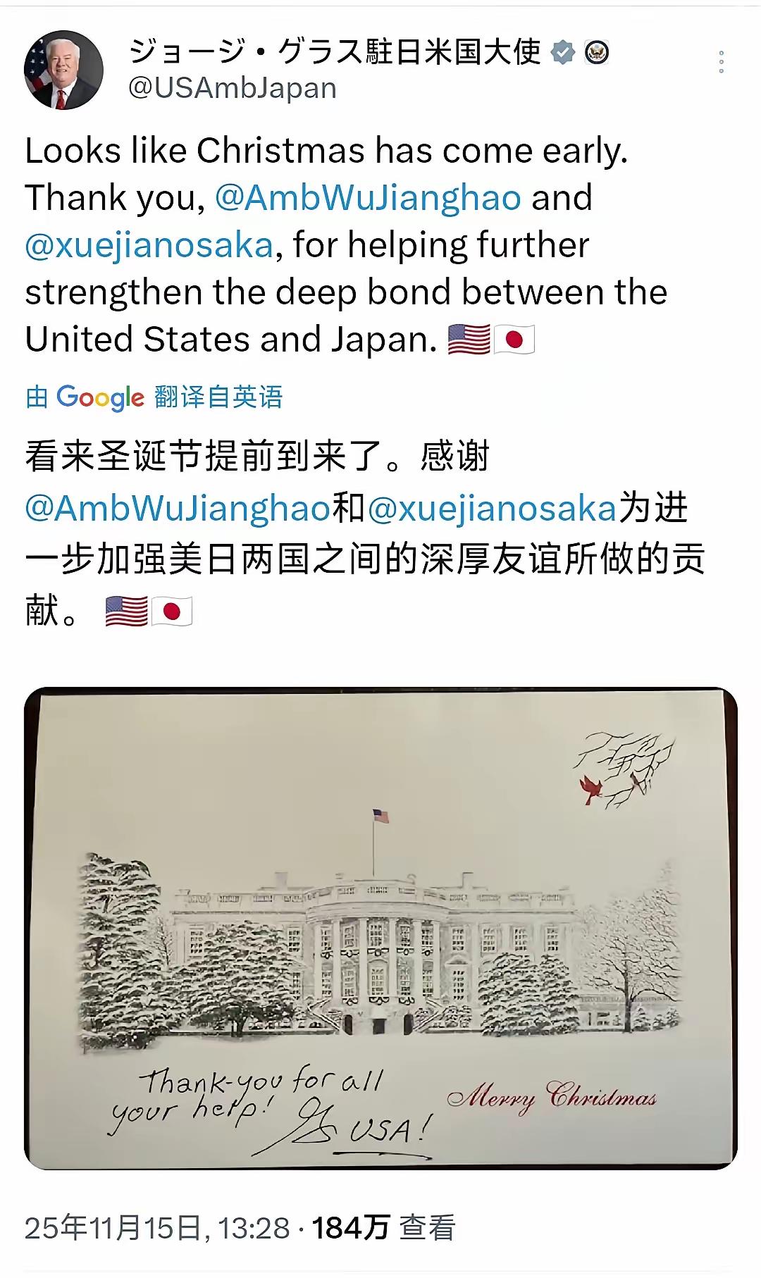 美国驻日本大使格拉斯15日发文:“看来圣诞节提前到来了。感谢中国驻日本大使吴江浩个中国驻日本大阪总领事薛剑为进一步深化美日之间的深厚友谊所做的贡献。” 可以确信,不管这个格拉斯怎么说阴阳话,只要他去问问特朗普就会知道,当日本全国沦为战场时,美国只会也只能搬个小板凳,欣赏中国是如何翻拍他们在1945年拍的把东京、广岛和长崎变成火海的电影。那个时候,这个格拉斯一定会忘了他今天说的美日之间的深厚友谊。这个格拉斯之所以说这种阴阳话,大概被高市早苗这个日本的妈妈桑摸过或者被什么过了,否则他不会说。