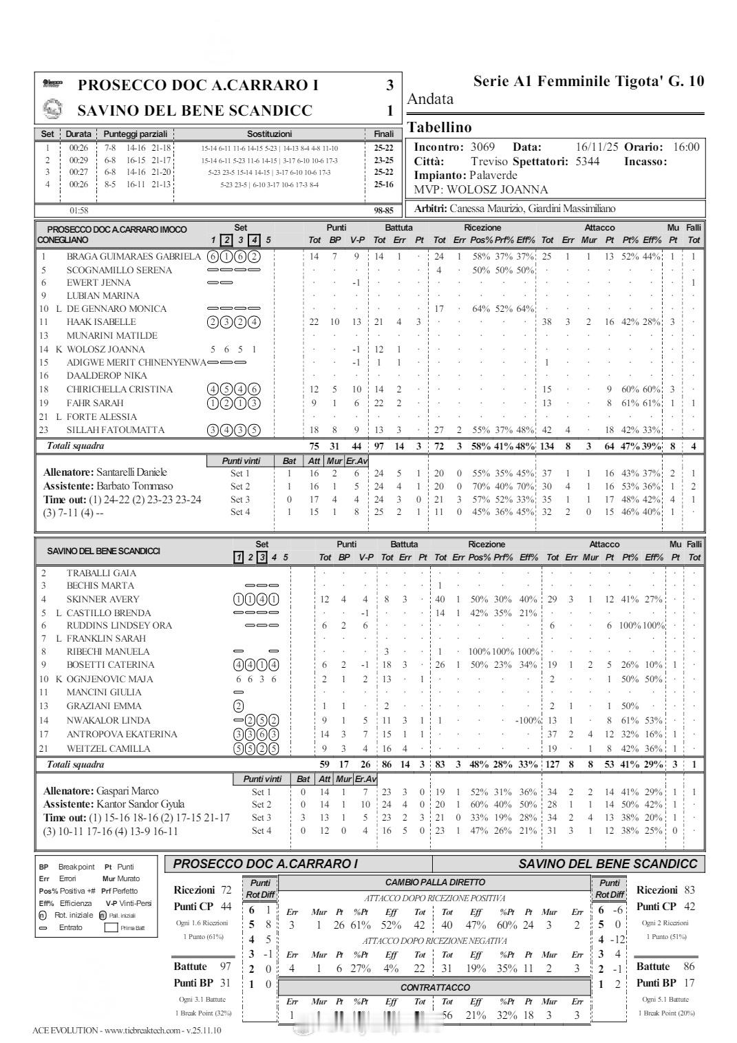 【意甲女排科内3-1斯坎迪奇取11连胜 哈克22分沃沃什MVP】 11月16日特雷维索,意甲女排第十轮焦点战,领头羊科内利亚诺主场3-1(25-22/23-25/25-22/25-16)击败排名第二的斯坎迪奇,取得11连胜并且将领先优势扩大为7分。哈克22分、西拉18分、加比14分、奇里切拉12分、沃沃什当选MVP,安特罗波娃14分、斯金纳12分。