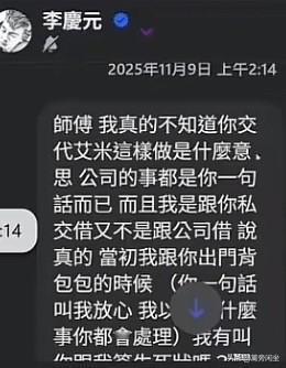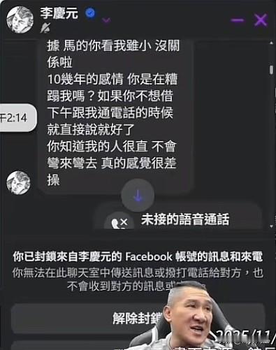 馆长连夜开直播,曝光李庆元借钱的聊天记录。 聊天记录右下角的一行小字,清楚的显示出馆长已封锁来自李庆元的讯息和来电。 显然,馆长拉黑了李庆元。两个人之间切断了直接交流的通道,双方有话只能到媒体上说,或者去找律师说。 馆长称:这三个人好吃懒做,开我的车,领我的钱,吃我的饭,开公司里的保时捷,说我性骚扰他的那个人现在开的车是奥迪。 公司每个月为他们支付大概有100万元的薪水及其他开支。 在馆长的反思梳理中,这一次突如其来的翻脸,导火索可能来自于李庆元最近一次的借钱事件。 李庆元打电话开口向馆长借钱100万,馆长安排公司会计打钱,会计按制度办事,发短信息给李庆元让他来公司签字,这个细节引起了李庆元的强烈不满。 馆长公布了与李庆元的聊天记录。 李庆元发给馆长的信息里用词非常激烈,看似积压了很久的怨气。 李庆元短信回复道:师傅,我不知道你安排会计这样做是什么意思,公司的事都是你一句话而已。我是问你借,又不是问公司借。 ma的,你看我虽小,没关系的啦,十几年的感情,你是在糟蹋我吗? 如果你不想借,下午通电话的时候直接说就好了。 真的感觉很差。 cao 李庆元短信中洋洋洒洒一长串文字,很多都是反问句,在结尾连问候语都用上了,说明李庆元对馆长的不满,并非一日之寒。至少,在短信里,李庆元对馆长没有基本的尊重和感恩。 李庆元100万元的借款已到账。