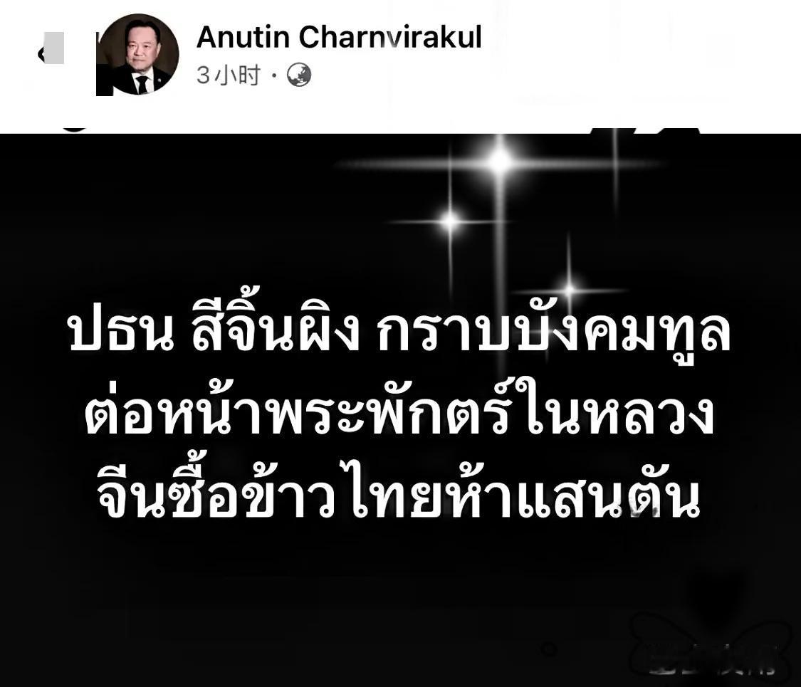 泰国总理兼内政部长阿努廷·陈威拉恭,在脸书发帖子说:“东方大国那边当着泰国国王的
