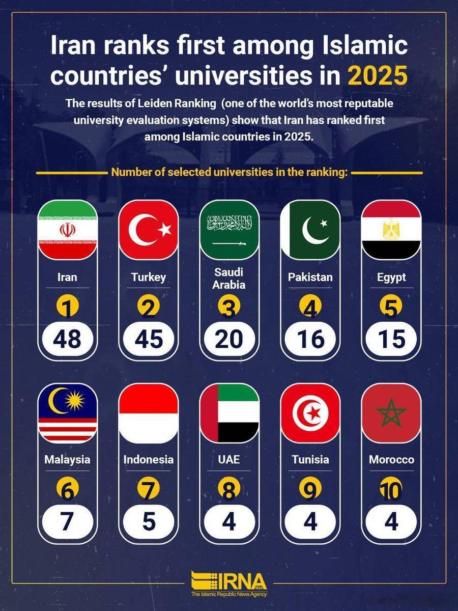 伊朗在伊斯兰国家中继续保持大学数量第一的位置,拥有48所高等教育机构。土耳其和沙特阿拉伯分别以 45 所和 20 所大学位列第二和第三。