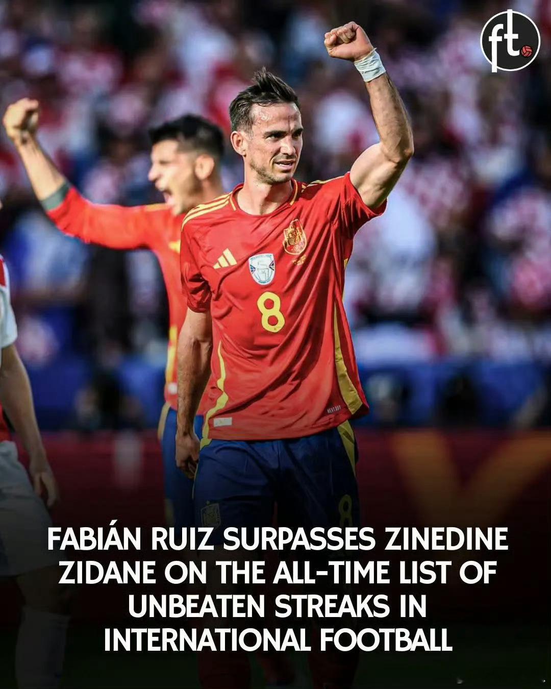 法比安·鲁伊斯已超越齐达内,跻身国际足球历史不败场次纪录榜单。🇪🇸 卡洛斯·马切纳 —— 57场不败▪️ 2003年至2010年🇧🇷 马内·加林查 —— 49场不败▪️ 1955年至1966年🇪🇸 法比安·鲁伊斯 —— 40场不败(持续中)▪️ 2019年至今🇫🇷 齐内丁·齐达内 —— 39场不败▪️ 1997年至2001年