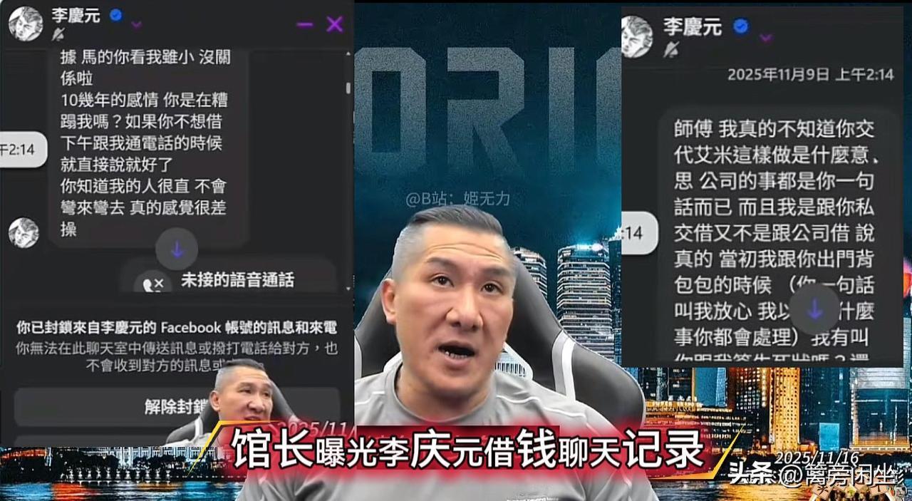 11月16号.馆长曝光李庆元借钱时的聊天记录。 李庆元对于馆长的新爆料暂时还没有在网络上出现。 馆长向网友报备自己的行程,11月18号.馆长按计划要去澳门办理商务,开设账户,期间有几天时间不能开直播。 李庆元等三人至今没有向网络曝出新证据。馆长担心在出差期间被对手打个措手不及。