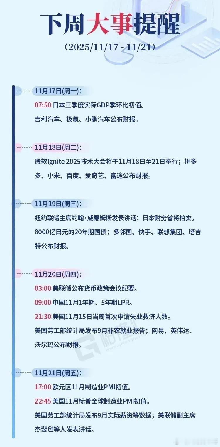 就两件事-AI巨头英伟达公布的财报以及美联储最关注的将补发的美国9月非农就业变动数据,此外下周四公布11月的LPR最新定价AI巨头英伟达的财报的发布也将影响着投资对最近“AI泡沫”声音的进一步验证,看巨头的业绩增长是否能延续强劲的优势,全球AI风向标迎来大考,北京时间11月20日凌晨,英伟达将在美股盘后公布2026财年第三季度财报,从41位华尔街分析师预测来看,英伟达该财季营收将达到548.896亿美元,大摩等机构对此次财报持有乐观态度,认为此次财报将是英伟达今年以来最强劲的一次财报,因美国政府停摆推迟,美国9月非农就业数据将在北京时间周四发布,从非官方数据Revelio Labs的数据显示,9月的美国非农就业变动人数为6. 01万人,此外有消息称这个数据后面将被下修至3.3万人,经济学家预计本次发布仅只有9月非农数据,而失业率或将无法公布,此外在周四国内也将迎来11月的1年期和5年期的定价,市场对于本次调整的幅度还是存在分歧,大幅调整的概率较低,多数机构看好小幅调整,在四季度稳增长需求上升,且美联储降息弱化了国内宽松政策的外部掣肘,央行或降息降准带动LPR下调;招联首席研究员董希淼则预测,11月LPR可能有5 - 10个基点的降幅,此外广开首席产业研究院王运金提出,11 - 12月LPR有望下调10 - 30个基点,且5年期以上LPR下调幅度可能更大,以此助力房地产市场企稳,但目前商业银行净息差处于历史最低点,近期中长端市场利率上行推高了银行融资成本,报价行主动下调加点的动力不足,这会限制LPR的下调空间,也让11月LPR是否下调仍存在一定不确定性。