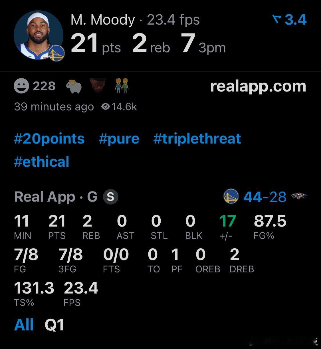 手感火热!摩西-穆迪首节命中7记三分独得21分👀