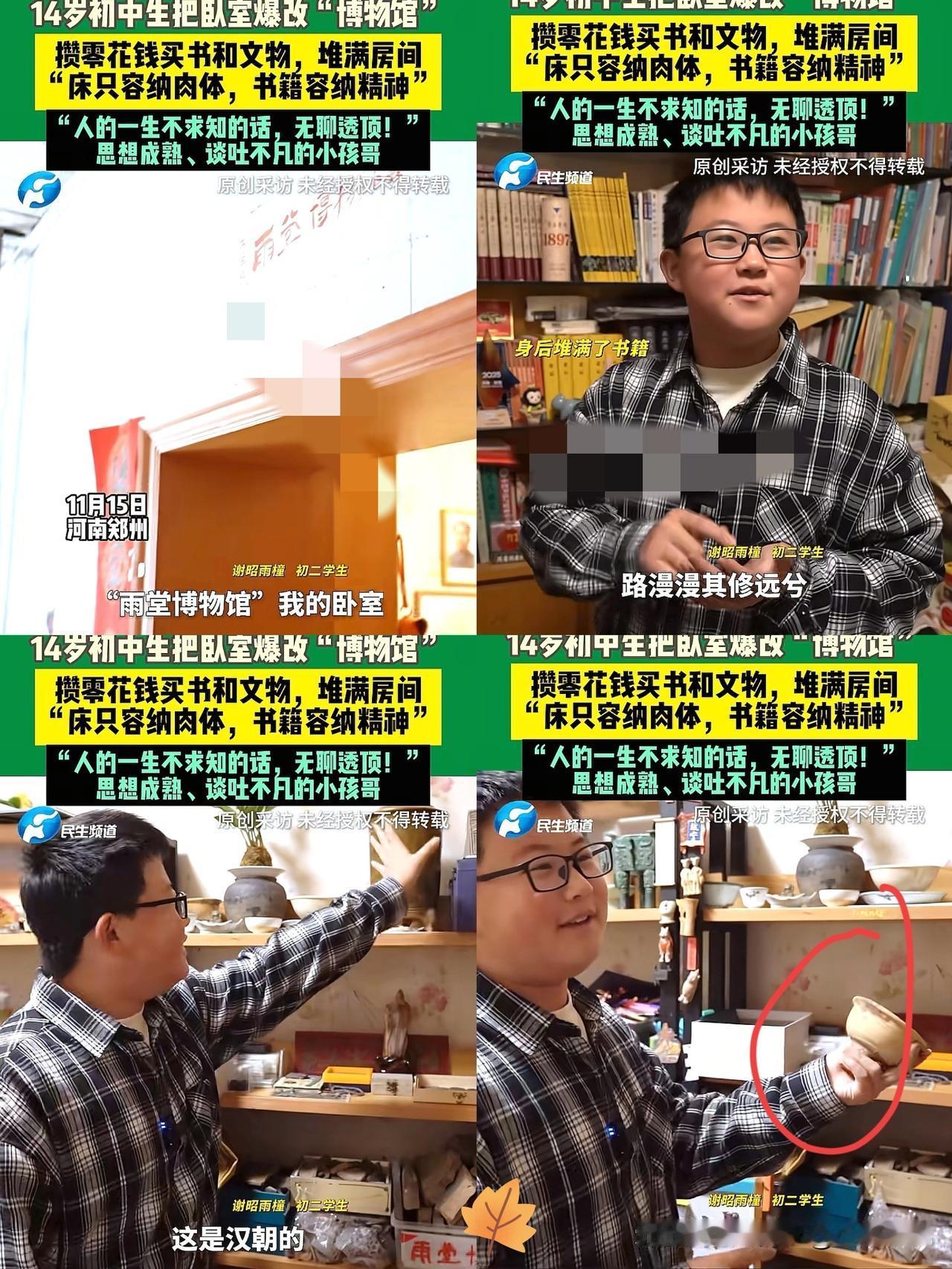 “这男孩日后必成大器!”河南郑州,一个14岁男孩竟干了一件远超同龄人的大事!他将自己的卧室改造成了“博物馆” 直接把自己卧室改成"雨堂博物馆",满屋子都是书籍和文物,活脱脱一个小"历史达人"! 当同龄孩子忙着买玩具、吃零食时,他把零花钱和压岁钱全砸进了热爱里,袜子破了洞都舍不得换,直言"要把东西用到最后,不必追求物质生活! 房间里除了床全是"精神食粮",汉代陶片、北宋瓷片、元代高足杯样样齐全,面对镜头更是出口成章,"路漫漫其修远兮"的笃定模样,满是对知识的敬畏与渴求! 这孩子的通透太难得!真正的成长从不是物质堆砌,而是对热爱的执着和精神世界的丰盈! 这样的专注力和格局,未来必定前途无量! ​还有网友说:希望不要放弃,把你的爱好进行下去,你真的很棒!