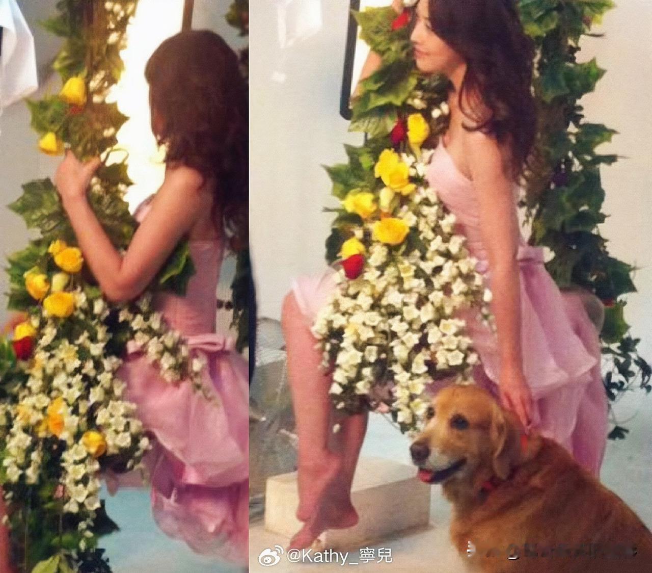 【🌺周海媚×花海暴击!】 藤蔓缠裙摆 风掀粉纱裙 赤脚蹭过春 金毛凑过来蹭她手
