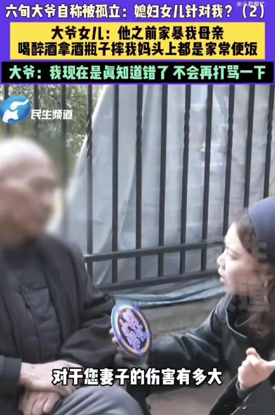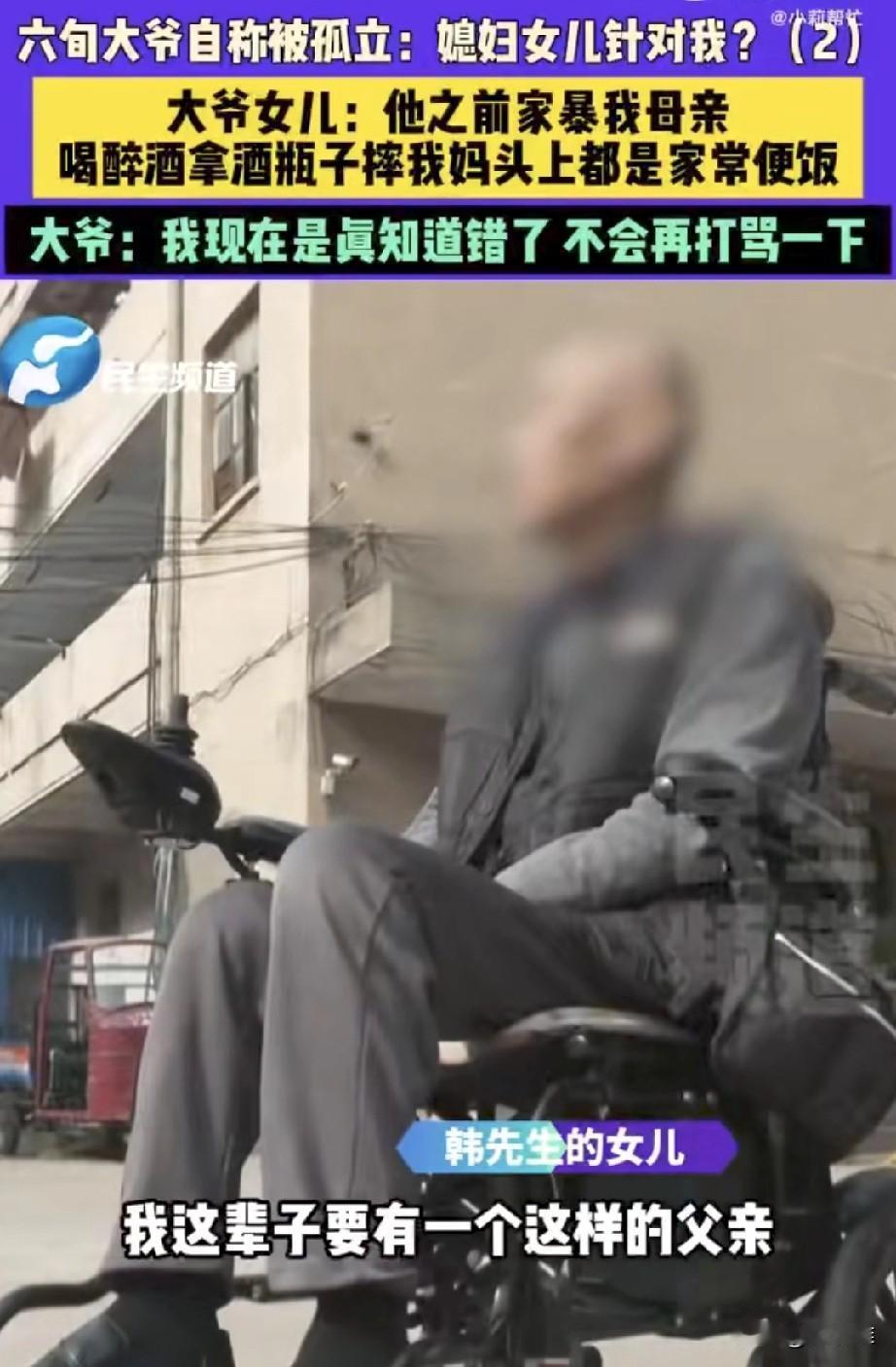 “报应来了!”男子年轻时家暴妻子,动不动就拿酒瓶砸,还打骂女儿并且拿刀吓唬她,如今60岁行动不便坐在轮椅上,妻子女儿都不愿意照顾,直接把他送到养老院,男子请求记者联系自己的家人,让记者转达自己的歉意,希望妻子和女儿能够原谅自己!女儿接到电话后只说了一句:“请你不要再骚扰我和我妈!” 我觉得男子不值得妻儿的原谅,他不是后悔家暴妻女,也不是良心发现真的承诺以后再也不家暴了,而是他坐轮椅了,身体没能力家暴了而已 !