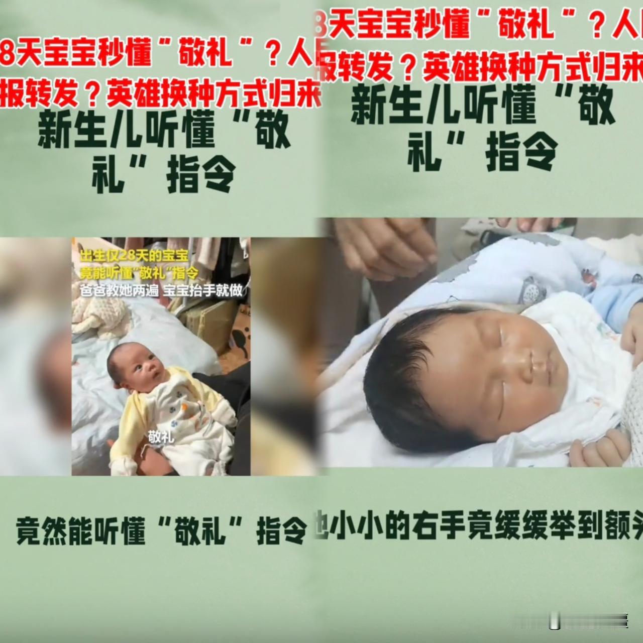 绝了! 贵州28天宝宝敬礼眼神超认真,教2遍就会,人民日报都转发了! 家人们谁看了不震撼!贵州28天的小奶娃,爸爸教了两遍敬礼,居然抬手就会,眼神还死死盯着爸爸,专注又坚定,完全不像刚满月的新生儿! 镜头特写里,宝宝小眉头轻皱,眼神不晃神,那股庄重劲儿,被网友疯传:“这哪是巧合,分明是老班长归队了!”当过兵的网友都认:“比刚入伍的新兵眼神还到位!” 就算专家说可能是条件反射,但这戳人的画面,连人民日报都转发点赞,说“藏着中国人最朴素的情感”。别人28天只会哭吃,这宝宝直接解锁“硬核技能”,暖心又神奇! 你们被宝宝的眼神戳中了吗?评论区聊聊你的感受! 宝宝敬礼奇迹 贵州宝宝敬礼 宝宝学敬礼
