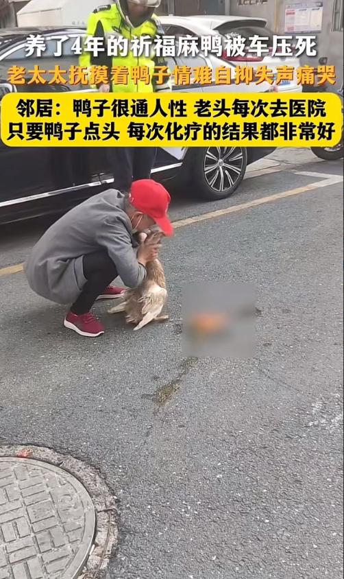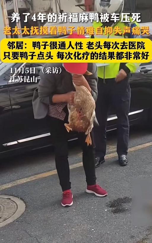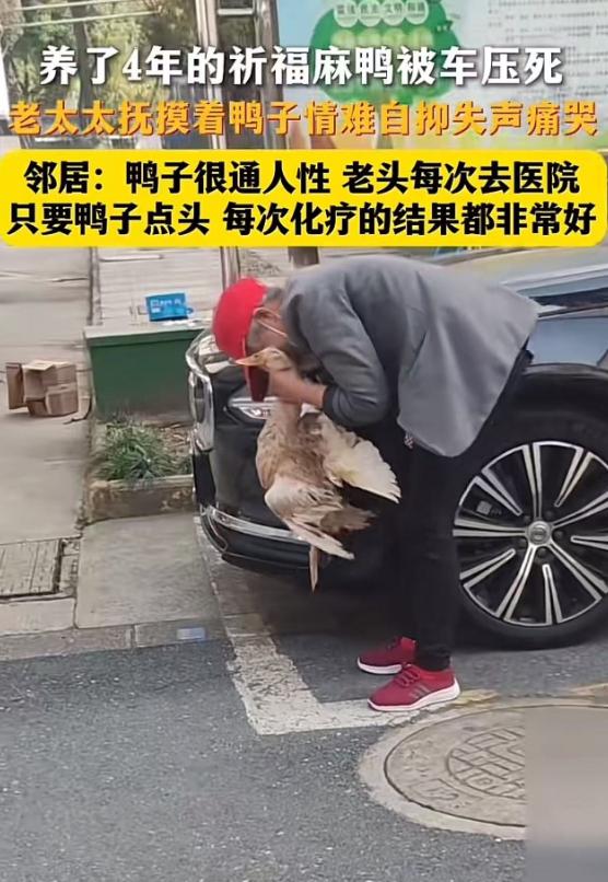 江苏昆山,养了4年的祈福麻鸭被车压死,老太太抚摸着鸭子情难自抑失声痛哭!邻居:鸭子很通人性,老头每次去医院只要鸭子点头,每次化疗的结果都非常好!网友:这是个悲剧,不光是有感情了,还有对老伴生死的精神寄托,着实令人哀伤! 江苏昆山的小巷子,前些天静不下来,一只麻鸭躺在路边,羽毛沾着尘土,已经没了气息,老太太蹲在那儿,手一遍遍摸过鸭身,哭声顺着风飘得老远,路过的人都忍不住停下脚步。 这只麻鸭陪了她四年,四年前老伴查出癌症,化疗把家里熬得没了笑声,老太太听人说养只活物能祈福,特意从乡下亲戚那抱回这只刚出壳的小麻鸭,起名“福鸭”。 每天天不亮,她就去菜市场捡新鲜菜叶,切碎了拌谷物喂;冬天怕它冻着,鸭舍旁塞暖水袋;夏天挪到树荫下,时不时洒点凉水降温。 鸭子真通人性,老太太坐在桌边发愁,它就摇摇摆摆蹭她裤腿;出门散步,总跟在身后,像个小尾巴。 最奇的是化疗前那阵仗,每次要去医院,老太太把鸭子抱到跟前,轻声问“老头子能挺过去不?”,鸭子总会慢慢低头再抬头,脖颈轻轻晃,像在点头。 邻居都见过这场景,有回鸭子没立刻点头,老太太急得眼圈发红,手不停摸它羽毛,直到那小脑袋动一下,她才松口气。 更神的是,只要鸭子点头,老伴化疗副作用就轻,肿瘤指标还往下降,医生都夸恢复得好,四年下来,这点头成了全家的希望信号,鸭子也成了比亲人还亲的存在。 11月5号那天出事了,老太太拎着菜往家走,鸭子跟在旁边,一辆快车呼啸而过,没等反应,鸭子已经被卷到轮下。 老太太扑过去,手刚碰到鸭身就僵住,跟着眼泪砸下来,嘴里反复念叨“我的福鸭,你咋走了”,她跪在地上,把鸭子抱在怀里,哭声撕得人心慌,路过的邻居想拉都拉不起来。 “那哪是鸭子啊,是她的念想,”邻居王阿姨叹着气说,这四年,老太太自己省吃俭用,给鸭子买最好的饲料,常跟人说“这是救命恩人”,有回老伴化疗回来,还笑着跟邻居讲“多亏鸭子点头,指标又降了”。 后来老太太把鸭子埋在院子角落,那片地挨着老伴常坐的藤椅,有人拍了视频发到网上,评论区看哭一群人。 有网友说“这哪是丢了只鸭子,是断了精神支柱”,有人感慨“老人的祈福,全是对老伴的心疼”,小区物业没多久就在事发路段加了警示标志,说要多盯着老人的情况。 傍晚路过那户人家,窗户透出微弱的光,院子里空荡荡的,再也看不见摇摇摆摆的鸭影,也听不到老太太对着鸭子念叨的声音。 其实哪有什么“灵性”,不过是老人把对老伴的牵挂,全寄托在了这只会点头的鸭子身上。 动物不懂祈福,但陪伴从不说谎,四年朝夕相处,鸭子成了苦难里的光,如今光灭了,疼的是两颗盼着活下去的心,这悲剧里藏着的,是普通人对抗磨难时,最朴素也最沉重的希望。