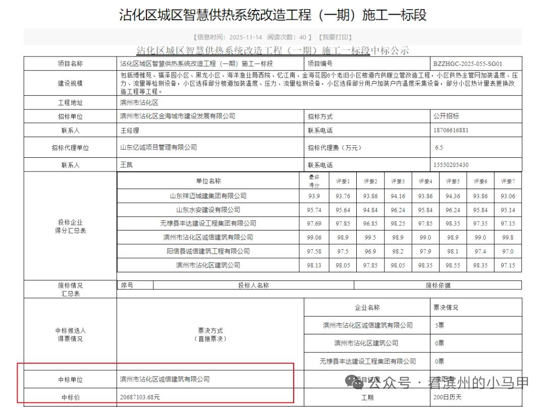 滨州6个小区供热系统将改造 近日,《沾化区城区智慧供热系统改造工程(一期)施工一标段中标公示》发布:建设规模:包括博雅苑、福泽园小区、黑龙小区、海洋渔业局西院、忆江南、金海花园6个老旧小区楼道内供暖立管改造工程,小区供热主管网加装温度、压力、流量等检测设备,小区选择部分楼道加装温度、压力、流量检测设备,小区选择部分用户加装户内温度采集设备,部分小区热计量表更换改造工程等工程。 该项目的中标单位为当地知名国企滨州市沾化区诚信建筑有限公司,中标价为20687103.68元,工期200日历天。 来源 综合滨州市公共资源交易中心发布