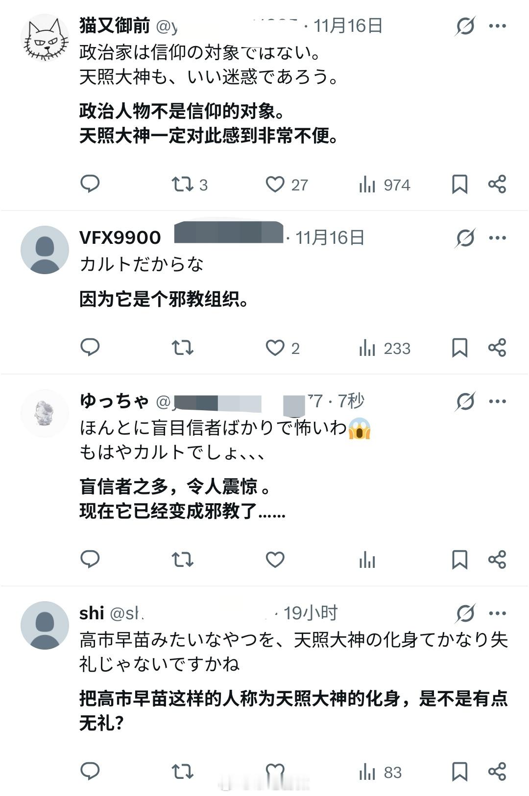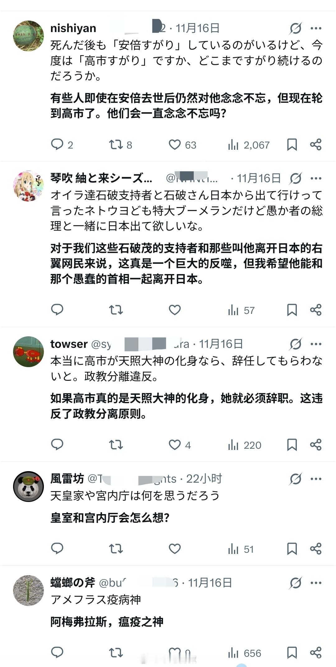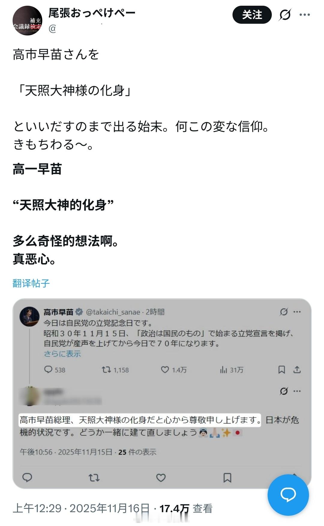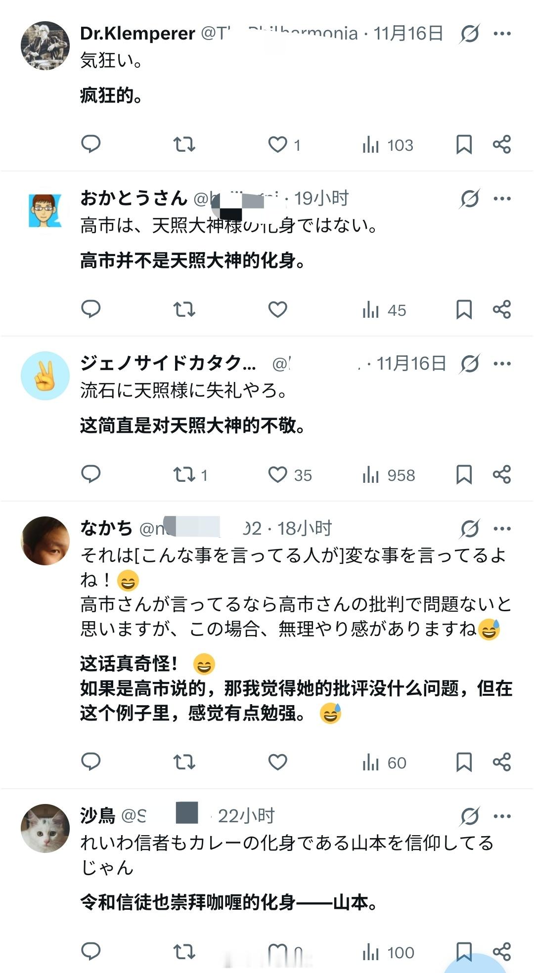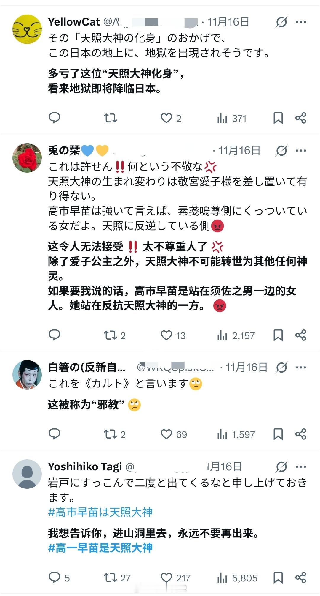 高市受到日本右翼的吹捧,已经成为所谓的“天照大神的化身”了,但很多日本网民觉得不妥,讽刺高市即将把“地狱降临日本”。