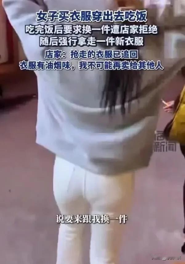 “真气人!”女子从服装店买了一件新衣服,买过之后也没摘吊牌,穿着衣服去吃了火锅,吃完火锅后,她又把衣服脱下来,拿回服装店要求退货,老板闻到衣服上的火锅味之后拒绝退货,女子却无理取闹的强行从衣架上拿了一件同款的新衣服,扭头就走,老板也是不依不饶,追上女子后把衣服夺了回来!老板气愤的说道:干了十几年的服装,从来没有遇到过这么不讲理的人!