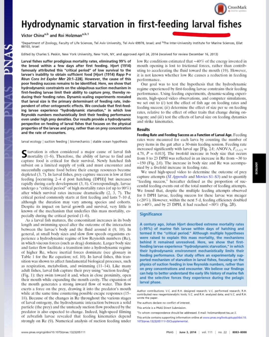这个就是冷知识了!实际上很多很多的鱼都会饿死!⚠️¹ 很多很多的鱼在幼体阶段,因为身体太小,相当于处在一个低雷诺数(Re)环境下,水的粘性对它们就像是浓厚的蜂蜜!这时候,哪怕周围都是猎物,它们也难以狩猎,吃到嘴里。所以容易饿死在食物旁边。² 这篇PNAS专门研究过小鱼苗批量饿死的流体力学问题。这就是知识的魅力:真实世界非常神奇,别轻易下结论,先调查调查再说。