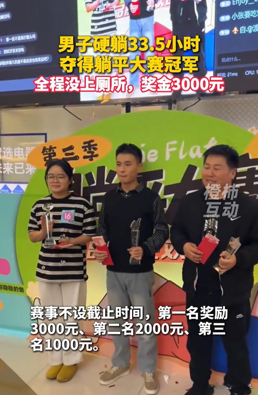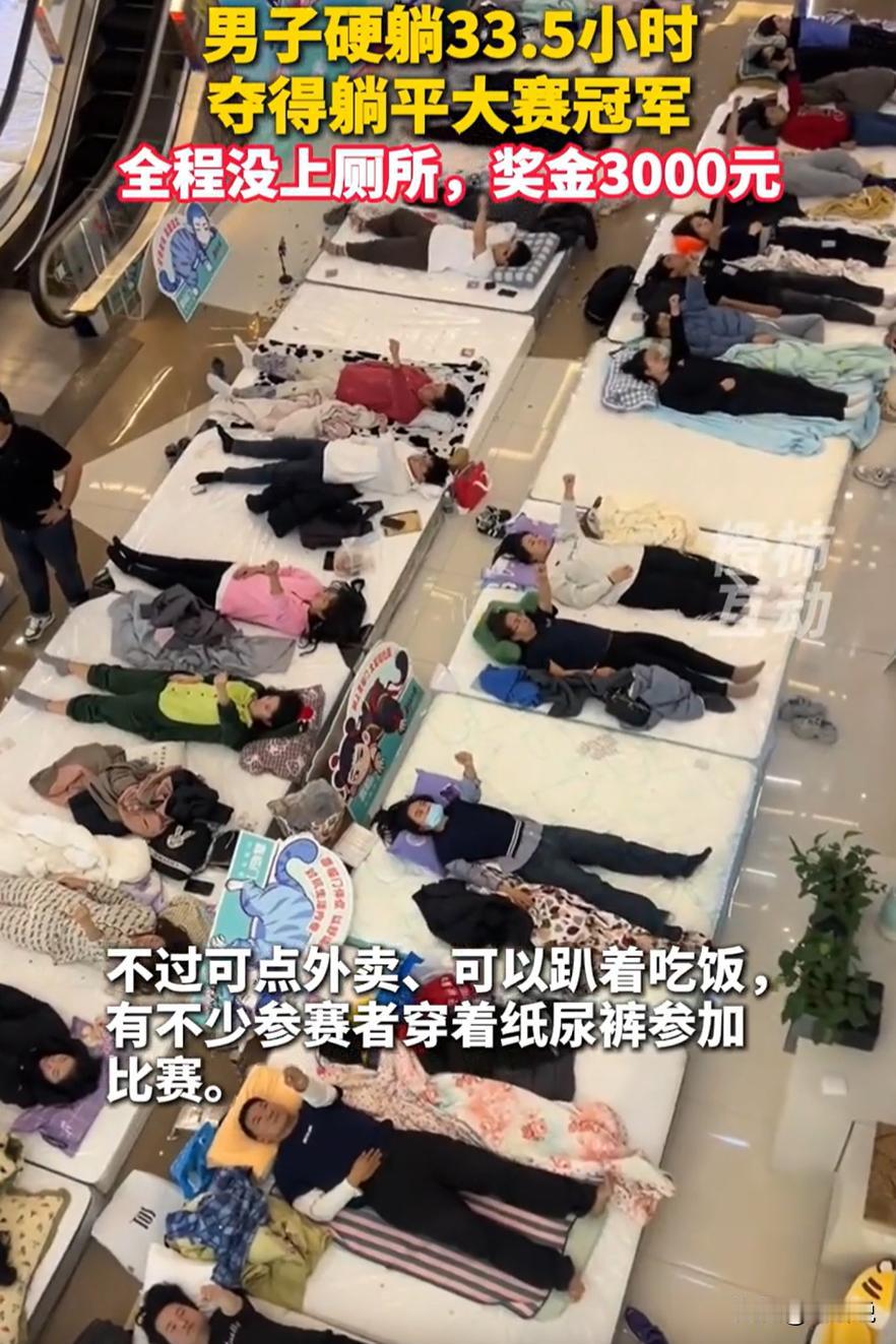这是个狠人!内蒙古,一商场内举办“躺平比赛”,第一名最终被一名小伙拿下,他全程硬躺33.5个小时,拿下了3000元的奖金,有网友觉得就是躺着很容易,但还真不是那回事 比赛一开始,规则看似简单,躺在床上就行,可以翻身、看手机、看书,但不能坐起、不能离开床垫,也不能上厕所。听着简单,但实际操作起来可不容易。33个小时下来,能保持体力、注意力不散的人并不多 为了应对长时间躺着的乏味,参赛者可以点外卖、趴着吃饭,不少人干脆穿上纸尿裤,以防影响比赛,这就已经体现了他们对胜利的认真态度 随着比赛时间延长,主办方觉得光躺着没挑战性,就增加了举手、抬腿等动作,这才真正考验人的毅力和身体控制。最后的决赛阶段,两名选手在床上角逐,又坚持了二十多分钟,最终一位小伙以33.5小时的成绩拿下冠军 有网友说:这才30多个小时,要是奖金高点,我能躺到过年 其实这让我想起一句话:看起来容易的事,做起来往往并不简单 光躺在床上,好像没啥难度,可真正做到连续三十多个小时不坐起、不离开床垫,还得完成主办方增加的动作要求,身体和心理都在受考验。时间一长,肌肉酸痛、困意、饥饿感、上厕所的冲动……每一项都可能让你掉队。能坚持下来的人,不只是靠运气,更是靠自控力和耐力 想象一下,手机、书、外卖都在身边,但身体一直限制在一个位置,每一个动作都得精打细算,连翻身都可能消耗体力。纸尿裤、趴着吃饭,这些都是应对手段,但真正难的是心态 你必须告诉自己:就算累、就算想离开,也得忍住。33个小时下来,不只是身体的疲惫,更是心理的拉锯战 所以说,下次当你觉得某件事“很容易”时,不妨亲自试一试。也许你会发现,即便是躺着,要躺出个名堂来,也需要非凡的毅力和决心